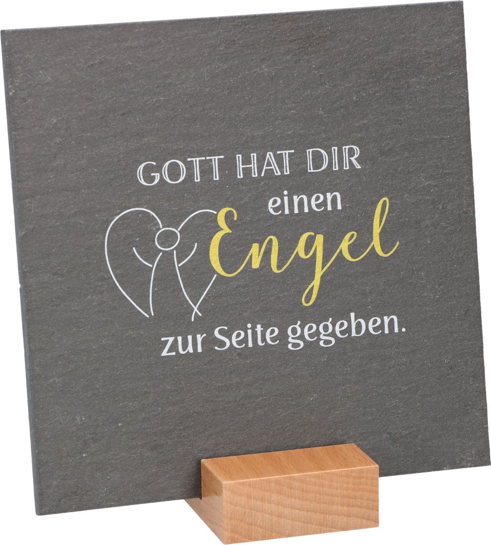 Schiefer Momente: Das sind die Kleinen, die Stelen, die eigentlich keine sind. Mit nur 12 cm x 12 cm passt die kleine Schieferplatte mit Aufsteller aus Holz auf den Schreibtisch, den Computertisch, die Ablage in der Garderobe. Überall da, wo die Erinnerung an den Engel so tröstlich ist, hat die kleine Tafel aus Schiefer ihren Platz.