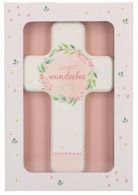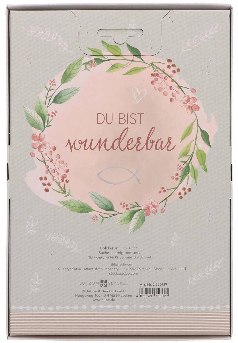Dieses detailreich gestaltete Kinderholzkreuz misst 11 x 18 cm und wurde aus robuster Buche gefertigt. Eine weiße Lackierung bildet dessen Produktbasis, veredelt durch einen hochwertigen Farbdruck. Dieser zeigt einen Blumenkranz in der Mitte dessen sind ein Herz und ein Fisch abgebildet. Diese symbolisieren die Zugehörigkeit zum Christentum und Gott, während der aufgedruckte Artikeltext unterstreicht: Du bist wunderbar.