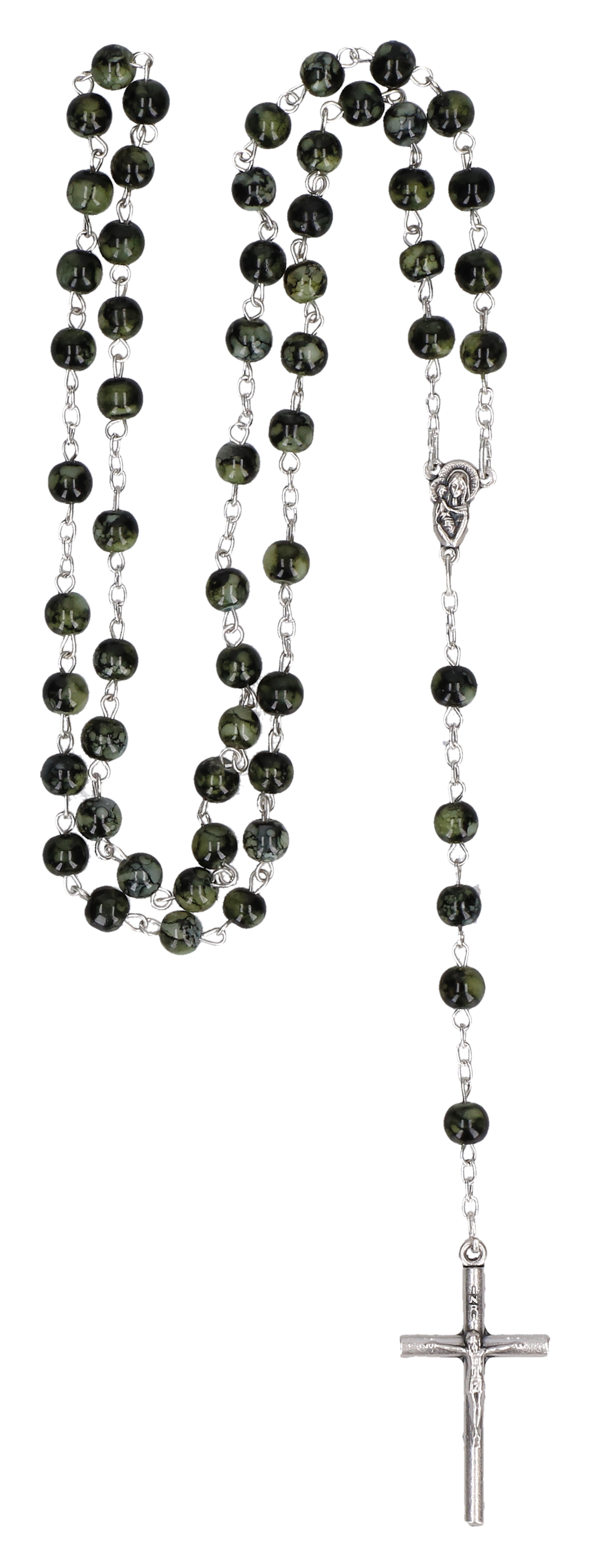 Rosenkranz mit grünen Glasperlen in Marmoroptik, gekettelt, mit Kreuz aus Metall, 48 cm lang; Lieferung in Geschenkverpackung