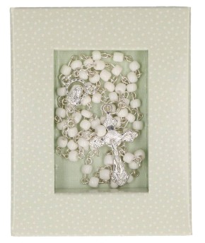Rosenkranz mit weißen Glasperlen, gekettelt, mit Kreuz aus Metall, 38 cm lang; Lieferung in Geschenkverpackung