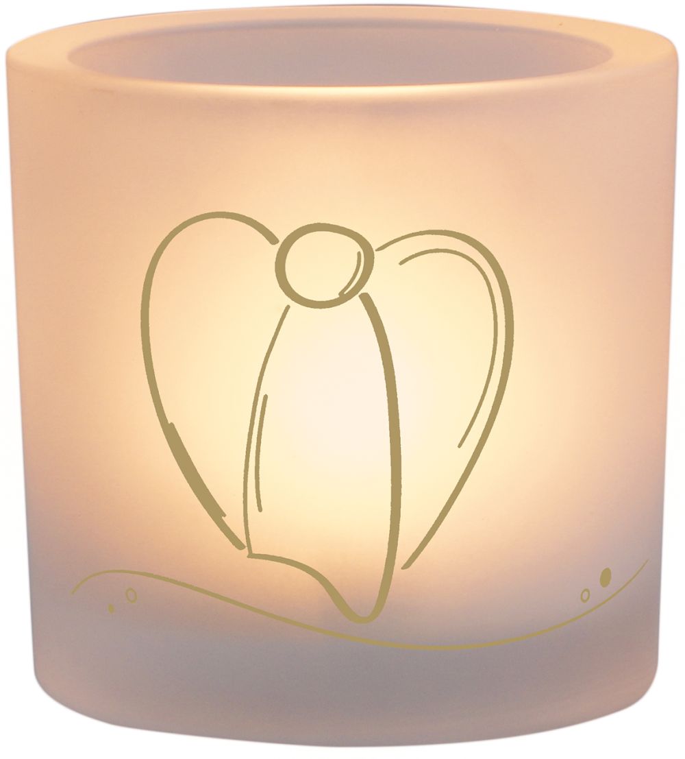 Das moderne LichtMoment "Dein Engel" begeistert sowohl als Deko-Element im Regal als auch als stimmungsvolles Windlicht mit einer hellen Flamme. Das formschöne Modell aus mattem Glas ist mit einem optisch ansprechenden Golddruck versehen. Der fromme Segensspruch "Dein Engel schenkt dir ein Lächeln und bringt Licht in dein Leben" zaubert ein Lächeln auf die Lippen der Betrachter. Diesen Text hat die Autorin Heidi Rose ausgewählt.