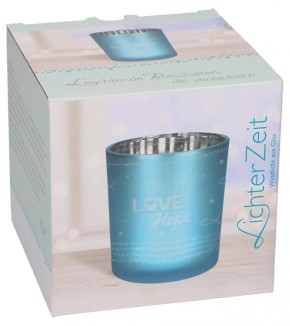 Windlicht aus türkis getöntem Mattglas mit Silberveredelung von Innen; Lieferung in Geschenkverpackung