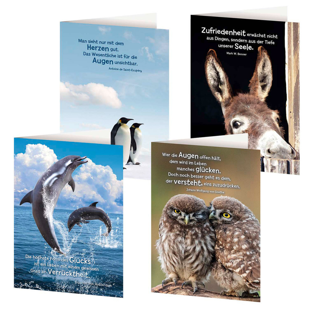 Einfach mal ein Auge zudrücken, zufrieden sein und ein bisschen verrückt: So lebt es sich gleich viel leichter. Tiere wissen das, es gibt einiges von ihnen zu lernen - und zu schmunzeln! Hat Gott sie doch so wunderbar vielfältig und sehr oft possierlich gestaltet. Die vier Grußkarten dieses Sets enthalten unterhaltsame wie ermutigende Weisheiten, gepaart mit herrlichen Tierfotografien, die heiter stimmen. Dank der beiliegenden Umschläge sind die frohen Grüße schnell verschickt. Und es lohnt sich, das Set mit den tierischen Klappkarten auf Lager zu haben, denn sie passen zu zahlreichen Anlässen und stimmen den Empfänger garantiert fröhlich. Mit Zitaten von Antoine de Saint-Exupéry, Johann Wolfgang von Goethe. Mark W. Bonner und Erasmus von Rotterdam. (4 Klappkarten, je 12 x 17 cm, mit Briefumschlägen)- originelle Tier-Motive mit humorvollen Lebensweisheiten- mit passenden Umschlagen