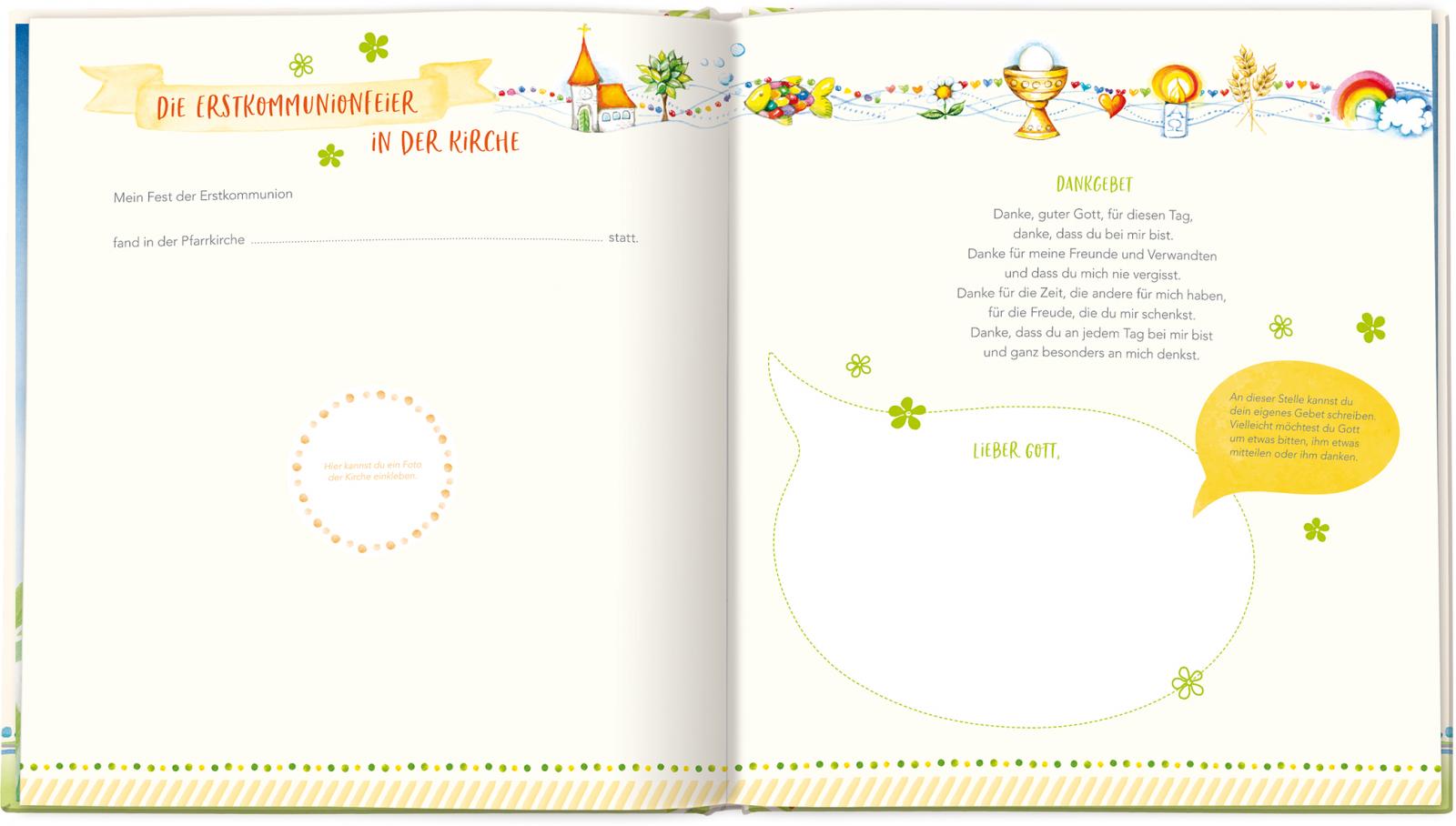 Neben Gebeten, Geschichten und Liedern bietet dieses wunderschön gestaltete Album viel Platz für Fotos, Eintragungen und Erinnerungen. Damit der Tag der ersten heiligen Kommunion noch lange im Gedächtnis bleibt.