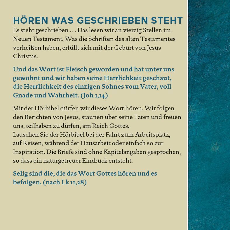 Das gesamte Neue Testament in der Einheitsübersetzung in Zusammenarbeit mit dem Domradio, gelesen von den sympathischen Stimmen von Ariane Jacobi und José Narciandi. Alle Kapitel können einzeln aufgerufen werden.