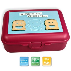 Brotdose mit fröhlichem Motiv und Vers  „Der Mensch lebt nicht vom Brot allein Mt 4,4“: Große Brotdose/Lunchbox mit praktischer Einlegtrennschale, die bis zum Deckel abschließt: Dadurch bleibt alles, z.B. Brot und Obststücke, auch nach dem Transport an seinem Platz. Die Box ist lebensmittelecht und garantiert BPA-frei. Made in Germany. 19x14x7 cm, Reinigung von Hand empfohlen