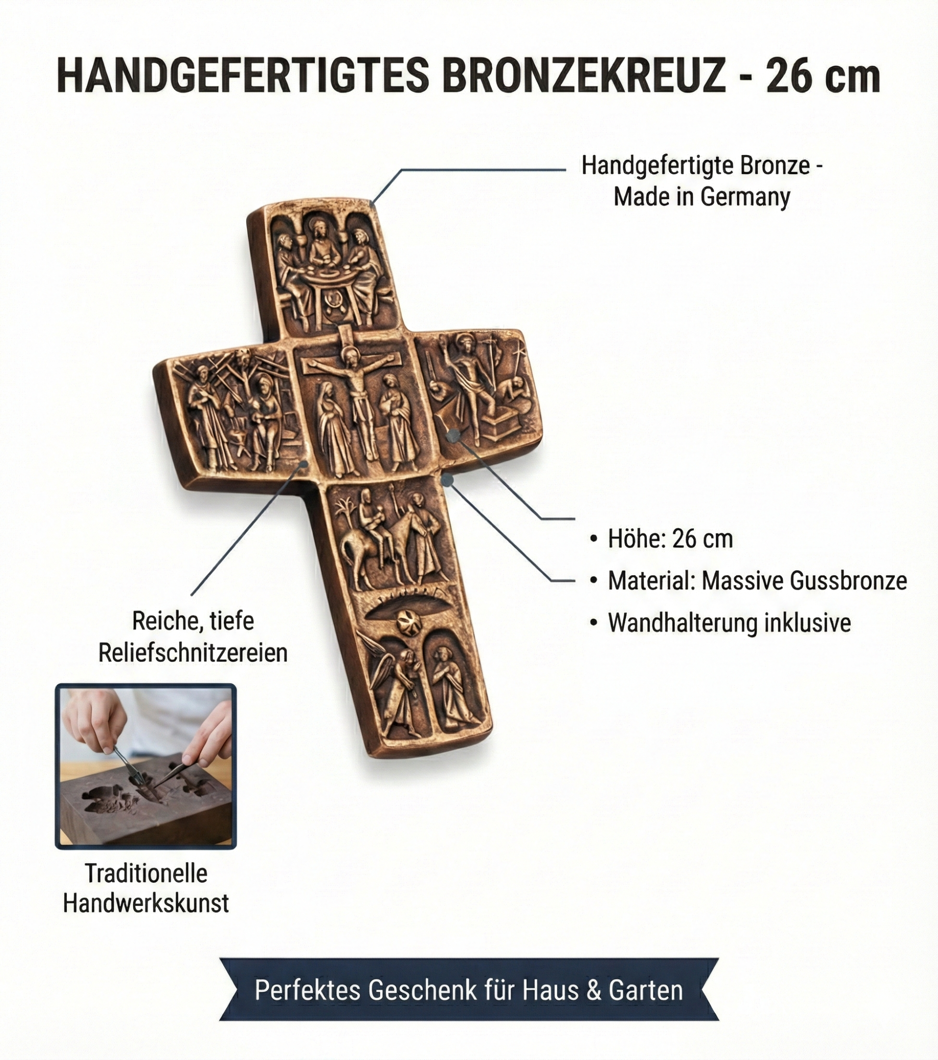 Dieses Bronzekreuz zeigt die Stationen im Leben Jesu, daher haben wir es hier Christus Kreuz genannt.