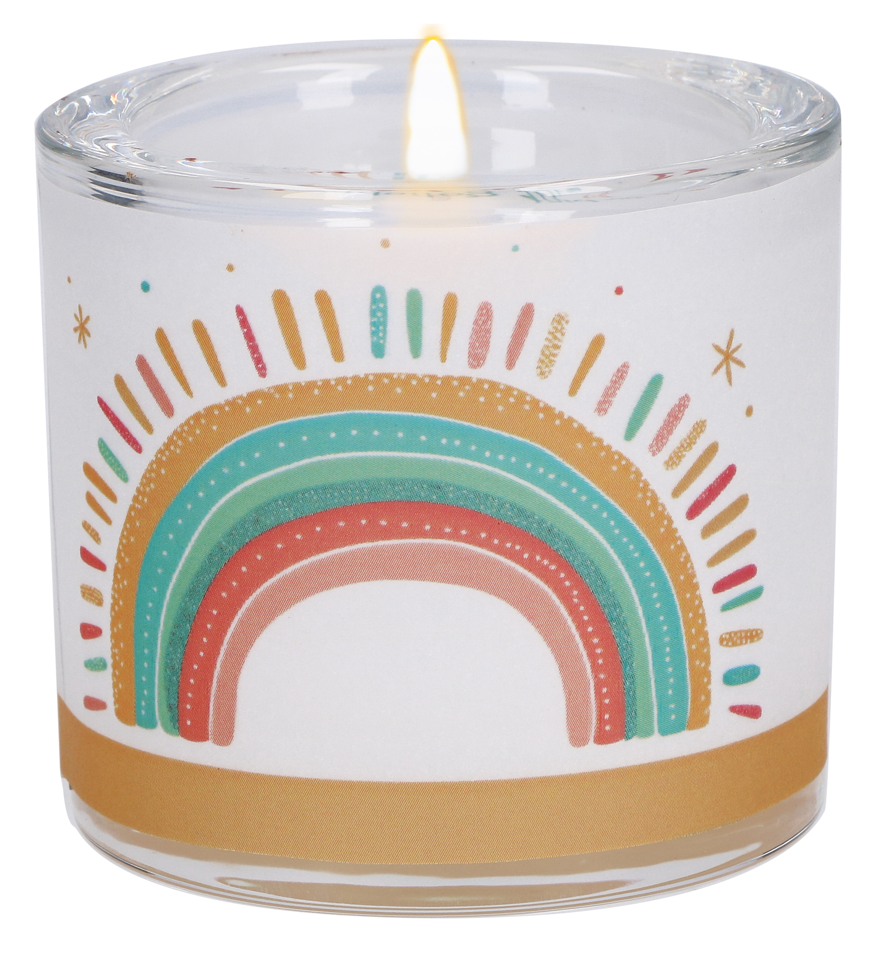 Dieses fröhliche Windlicht aus mundgeblasenem Glas ist ein liebevolles Geschenk zur Geburt oder zur Baby-Party. Der farbig bedruckte Pergamentumleger zeigt einen strahlenden Regenbogen in warmen Gelb?, Rot? und Türkistönen, umgeben von kleinen Punkten und Sternchen – wie ein buntes Willkommensfeuerwerk für das neue Leben.