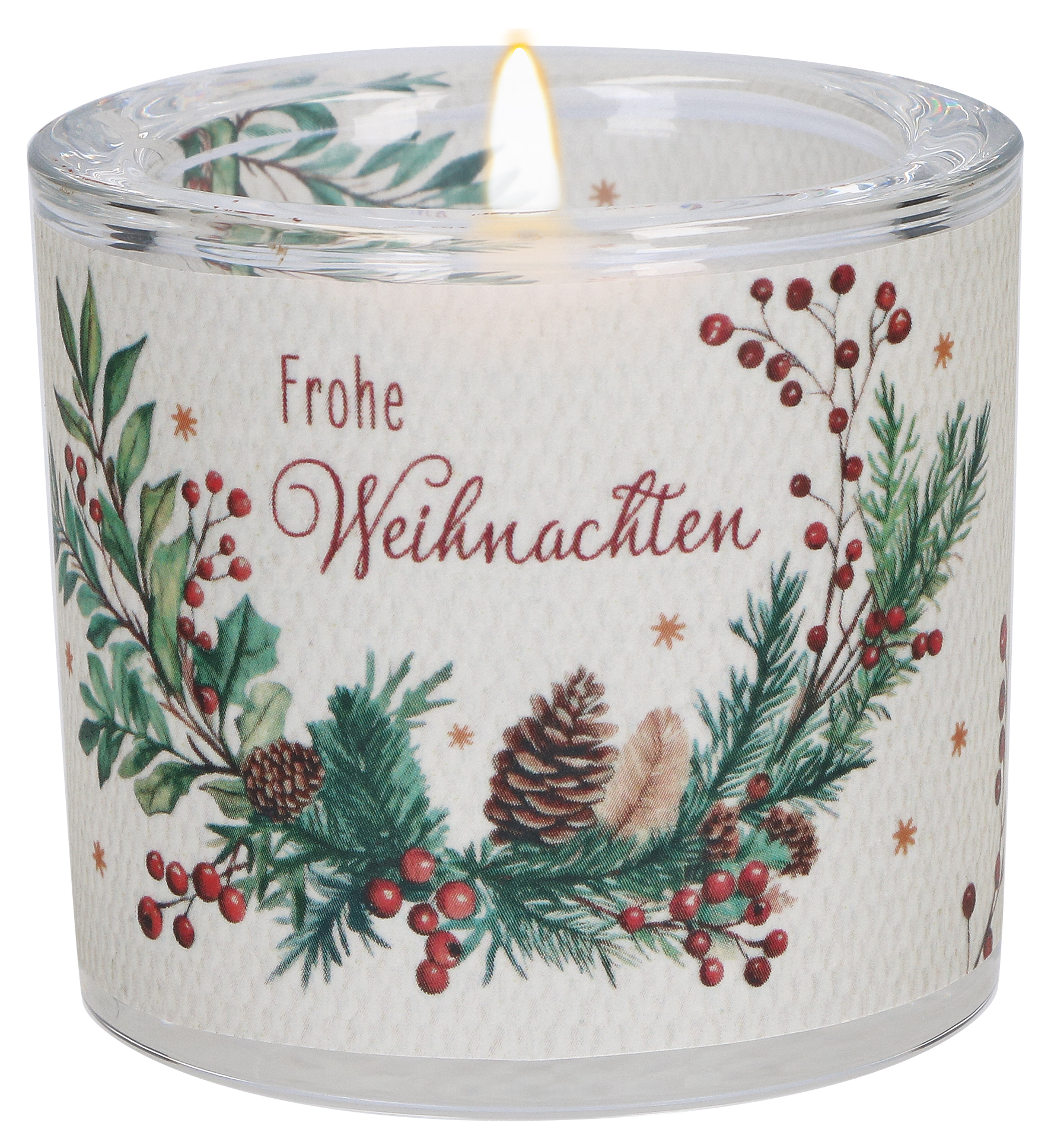 Dieses stimmungsvolle Windlicht aus mundgeblasenem Glas bringt das Leuchten der Weihnacht in Ihr Zuhause. Ein farbig bedruckter Pergamentumleger umhüllt das Glas und zeigt einen liebevoll gestalteten Kranz aus Tannenzweigen, Beeren und Zapfen – festlich umrahmt vom Schriftzug „Frohe Weihnachten“.