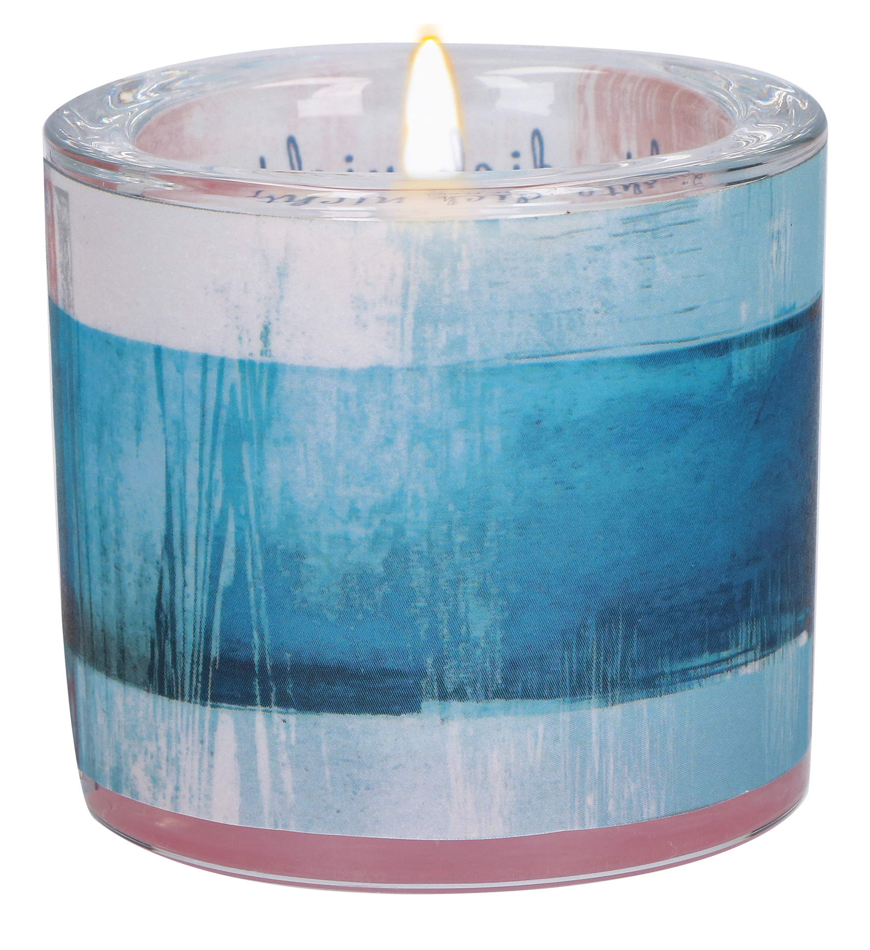 Dieses moderne Windlicht aus mundgeblasenem Glas setzt die Jahreslosung eindrucksvoll in Szene. Der farbig bedruckte Pergamentumleger zeigt ein abstraktes Farbspiel in Blau-, Rosa- und Rottönen, das an Horizont, Meer und Licht erinnert. Die sanften Übergänge und kraftvollen Flächen vermitteln Ruhe, Stärke und Zuversicht zugleich.