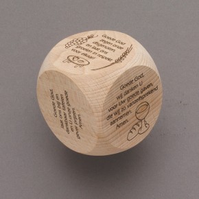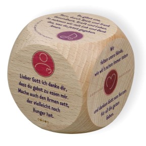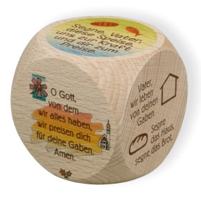 Das Tischgebet vor dem Essen zu sprechen und dem Herren für Speisen und Getränke zu danken, ist in zahllosen Haushalten hierzulande üblich. Mit einem Gebetswürfel lässt sich Abwechslung in das tägliche Aufsagen des Gebets bringen und auf verschiedene Weise Dank ausdrücken. Auf jeder der sechs Würfelseiten sind kleine Gebete notiert, das Auswürfeln des täglichen Tischgebets wird gerade mit Kindern zu einem großen Vergnügen. Durch die kunstvolle Gestaltung der Würfel mit liebevollen Motiven und handschriftlichen Gebetssprüchen wird jeder Würfel auch zu einem ästhetischen Hingucker, der Esstische auf christliche Weise schmückt.