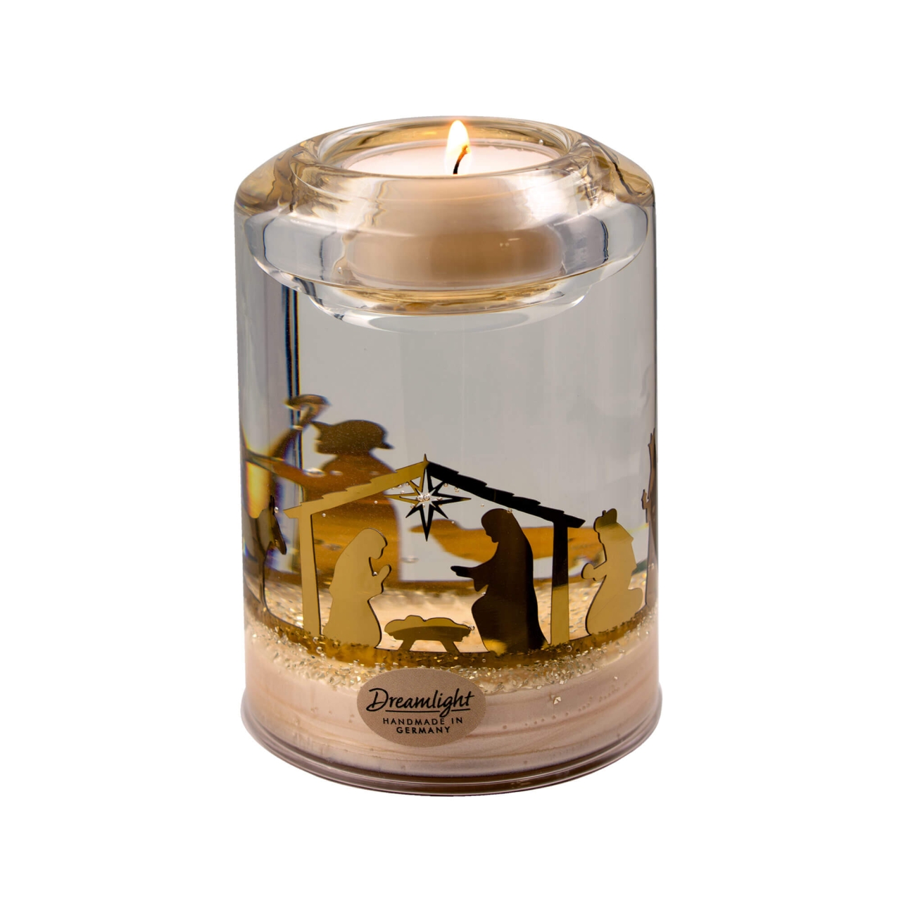 Handarbeit aus Deutschland! Ein absoluter Hingucker und etwas ganz Besonderes zu Weihnachten ist das handgefertigte Dreamlight-Teelichtglas mit Krippenszene.