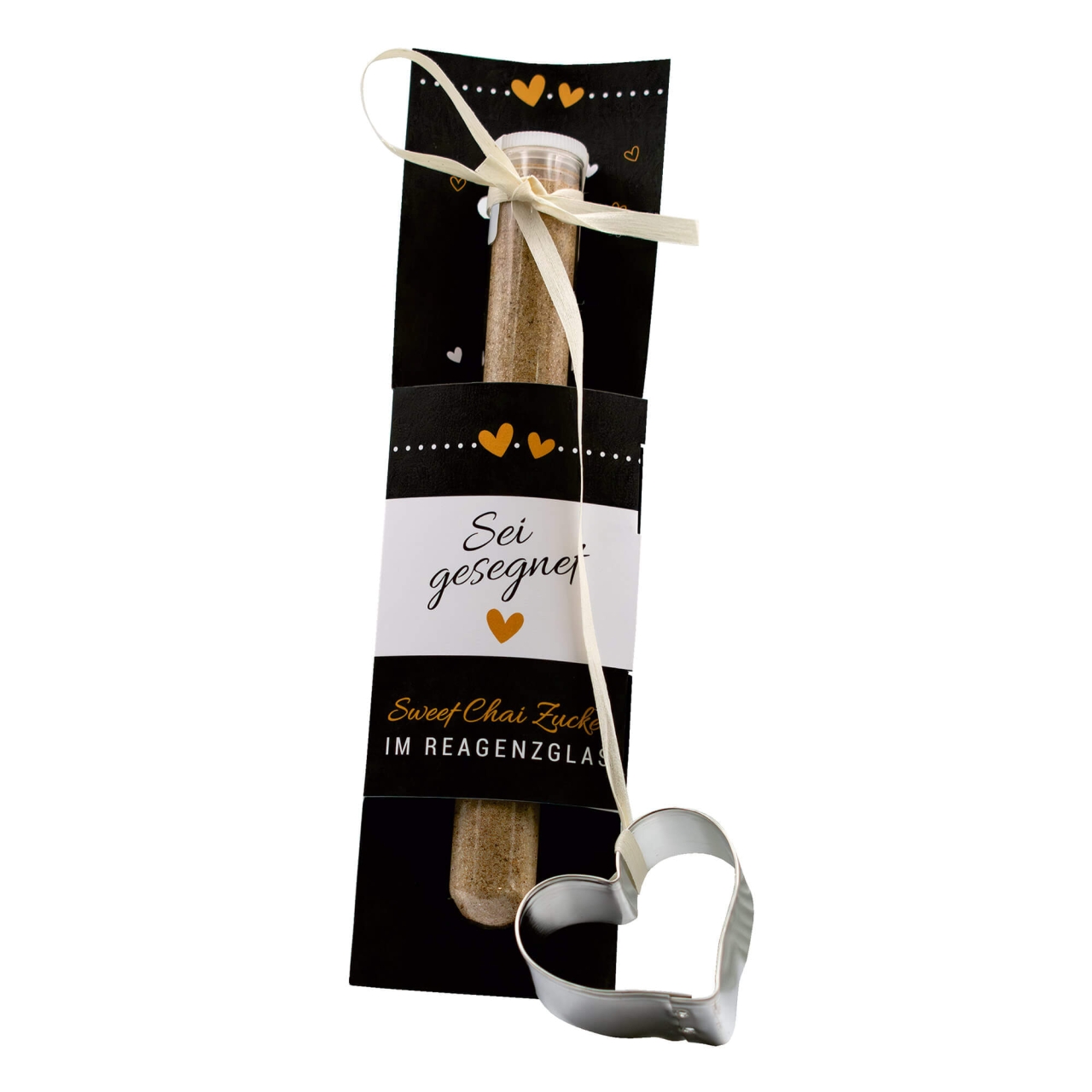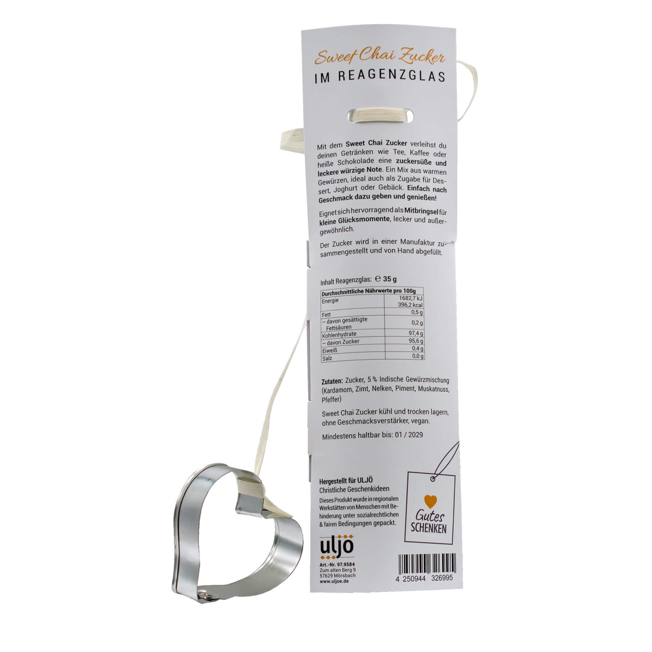 Mit einer ausgewählten Gewürzmischung aus Kardamom, Zimt, Nelken, Piment, Muskatnuss, … macht der „Sweet Chai Zucker“ im Reagenzglas jedes Heißgetränk aber auch Desserts und Gebäck zu einem besonderen Geschmackserlebnis. Hübsch als Geschenk verpackt mit bedruckter Banderole „Sei gesegnet“ und Ausstechförmchen „Herz“. Schenken und Gutes tun: Das Produkt wurde in regionalen Werkstätten von Menschen mit Behinderung unter sozialrechtlichen & fairen Bedingungen gepackt. Inhalt im Reagenzglas: 35 g.