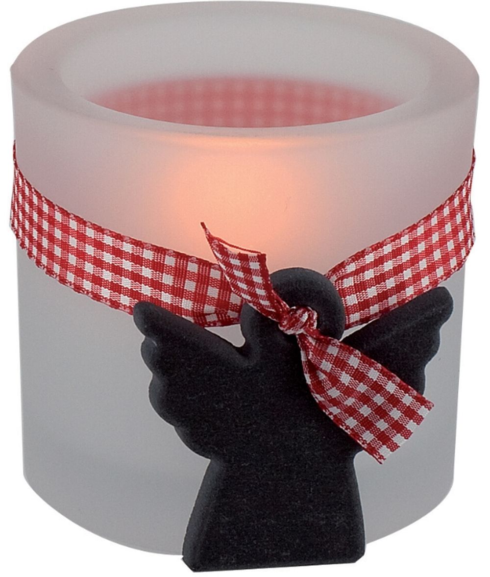 Glaswindlicht mit rot-kariertem Band und Schieferanhänger, Lieferung mit rotem Teelicht in Klarsichtbox