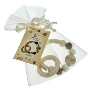 Greifling gefertigt aus ausgesuchten heimischen Hölzern, ungiftige Farben, speichelecht, Naturperlen. Eine Perle ist mit dem Ichthys-Symbol lasergraviert. Holz natur, Ø 8,5 cm. Verpackt im Organza-Beutel.