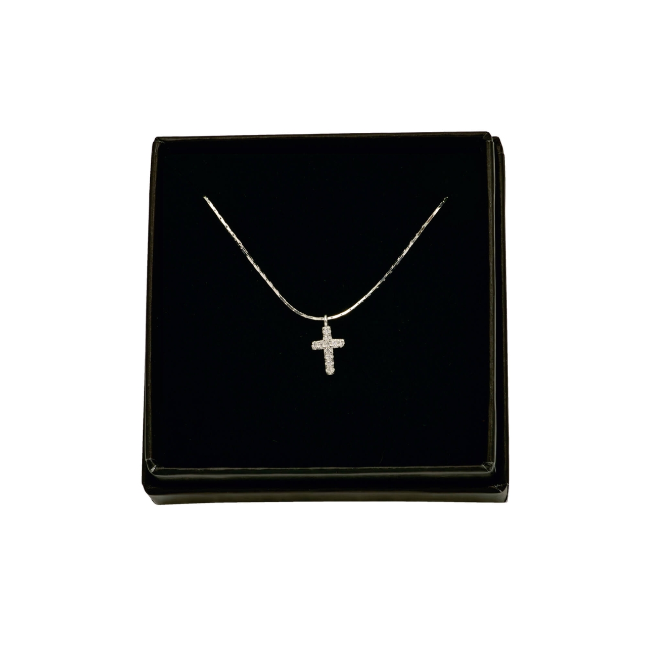 Elegante und filigrane Halskette aus 925er Silber mit Kreuzanhänger. Das Kreuz ist mit funkelnden Zirkonia-Steinen verziert. Verpackt im Schmucketui.
