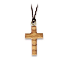 Kreuz aus Olivenholz (5 cm) an braunem Stoffband verstellbar bis 80 cm Länge im weißen Organzabeutel