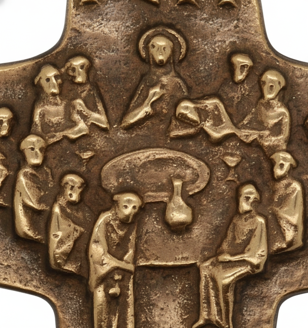 Für junge Gläubige ist die Erstkommunion das wohl wichtigste Ereignis, um lebhaft in die christliche Gemeinschaft aufgenommen zu werden und ihre Nähe zu spüren. Mit diesem handgefertigten Kommunionskreuz aus Bronze wird dieser Vorsatz in einem liebevoll gestalteten Motiv aufgegriffen. Im Zentrum des Kreuzes wird die Szene des heiligen Abendmahls dargestellt, über die Wörter am Rand steht der Spruch: Ich bin bei euch! Hiermit wird das Kommunionskreuz nicht nur zu einem wertvollen Symbol, um die Nähe Gottes und Jesu Christi zu empfinden, sondern auch die Bindung zu anderen Christen intensiver zu erleben. Das klassisch gestaltete Kreuz wird zu einem dauerhaften Wegbegleiter des jungen Menschen und kann mit seiner Öse einfach aufgehangen werden.
