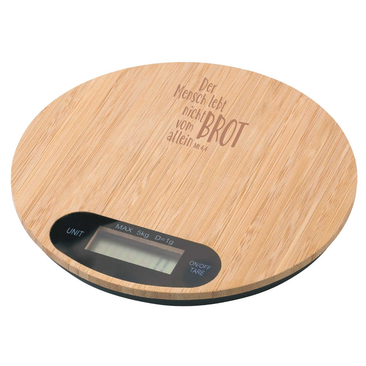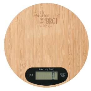 Elektronische Waage aus Bambus, mit großem Display und Touch-Funktion. Zum Wiegen aller trockenen und flüssigen Zutaten und Speisen. Wiegt bis zu 5 kg, Aufteilung: 1g. Mit Tara-Funktion, automatische Ausschaltfunktion, Anzeige für niedrigen Batteriestand und Überladung. Praktisch: Per Touch-Funktion lässt sich auf dem Display zwischen den Einheiten g, lb, oz, ml, fl.oz. wechseln. Graviert mit dem Vers „Der Mensch lebt nicht vom Brot allein Mt 4,4“. Durchmesser ca. 18,5 cm, Dicke 1,8 cm. Auch als Briefwaage geeignet. Inkl. Batterie und Anleitung, einzeln verpackt in Karton.