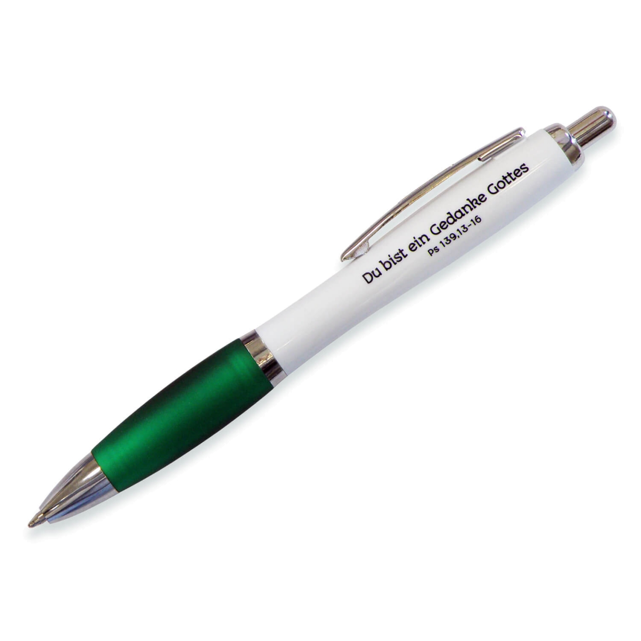 Jeden Menschen gibt es nur ein einziges Mal auf dieser Welt, denn „Du bist ein Gedanke Gottes“ (Ps 139,13-16). Ein tiefsinniger Vers auf einem Kuli in leuchtender Farbe.   Schreibfarbe: Blau