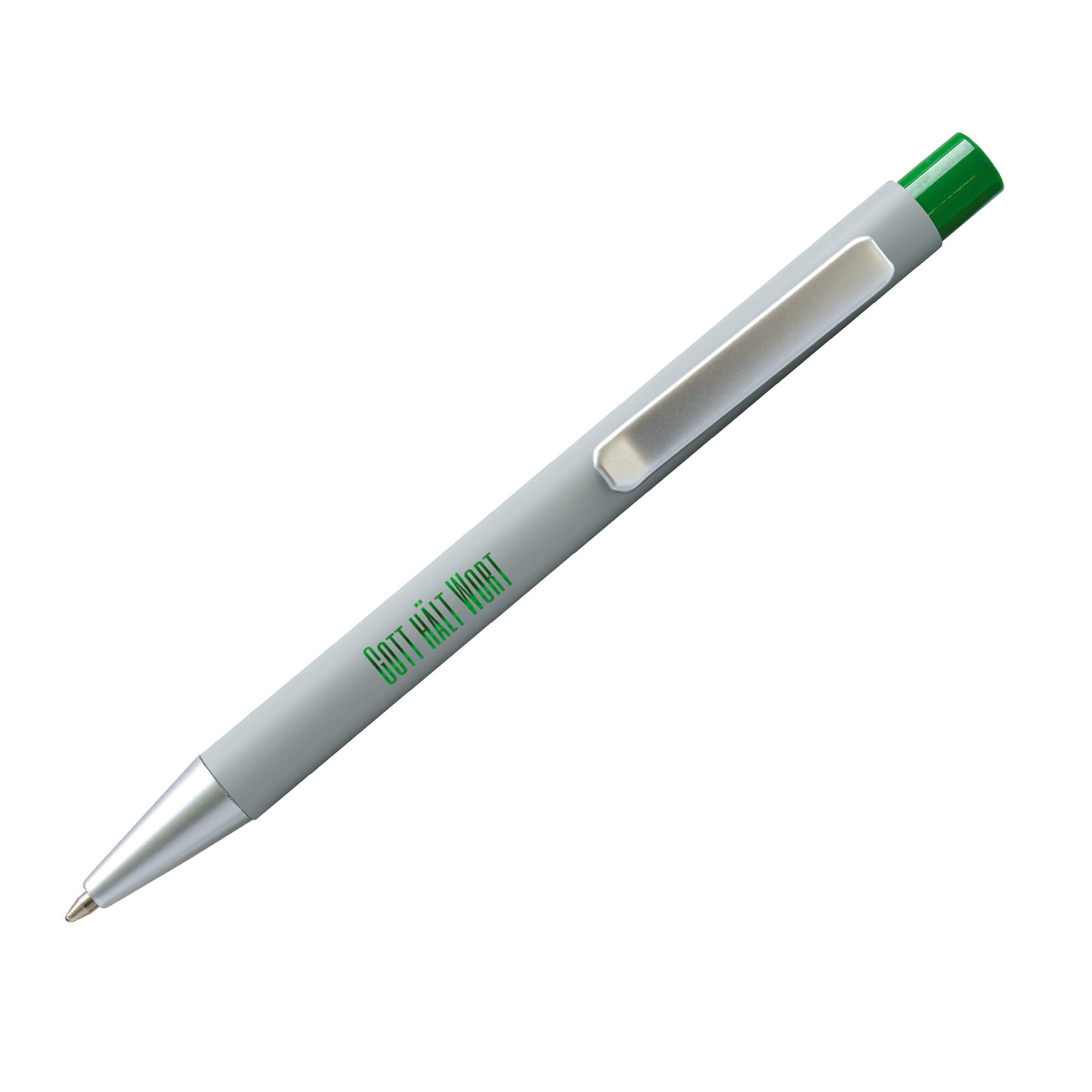 Kugelschreiber aus recyceltem Aluminium, kombiniert mit einem matten Metallclip und einer matten Spitze Glänzend in Szene gesetzt wird der Vers „Gott hält Wort“ dank der farbigen Unterlegung. Das sorgt für eine effektvolle Gravur. Mit jeweils farblich dazu passendem Drücker. Ausgestattet ist der Kugelschreiber mit einer Großraummine, blaue Schreibfarbe.