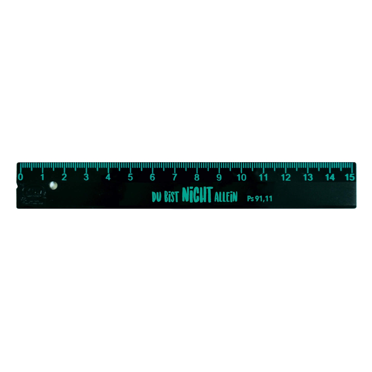 Lineal in Schwarz, Länge 15 cm. Hergestellt aus umweltschonenden, wiederaufbereiteten Kunststoffen, die größtenteils aus Verpackungsmüll stammen. Jeweils bedruckt mit dem Mut machenden Vers „Du bist nicht allein Ps 91,11“. In 2 Farbstellungen erhältlich.