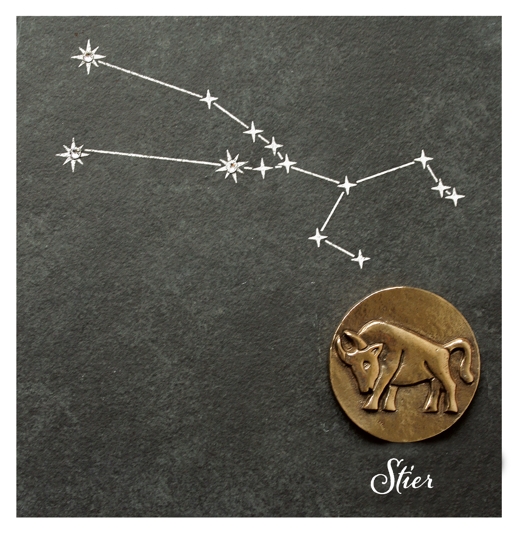Der Glanz der Sterne, dargestellt durch schimmernde Swarovski- Kristalle, das Dunkel des Nachthimmels, im tiefen Grau des ausgesuchten Naturschiefers und das strahlende irdische Glühen des gegossenen Bronzereliefs gestalten dieses Tierkreiszeichen: Stier (21. April – 21. Mai)