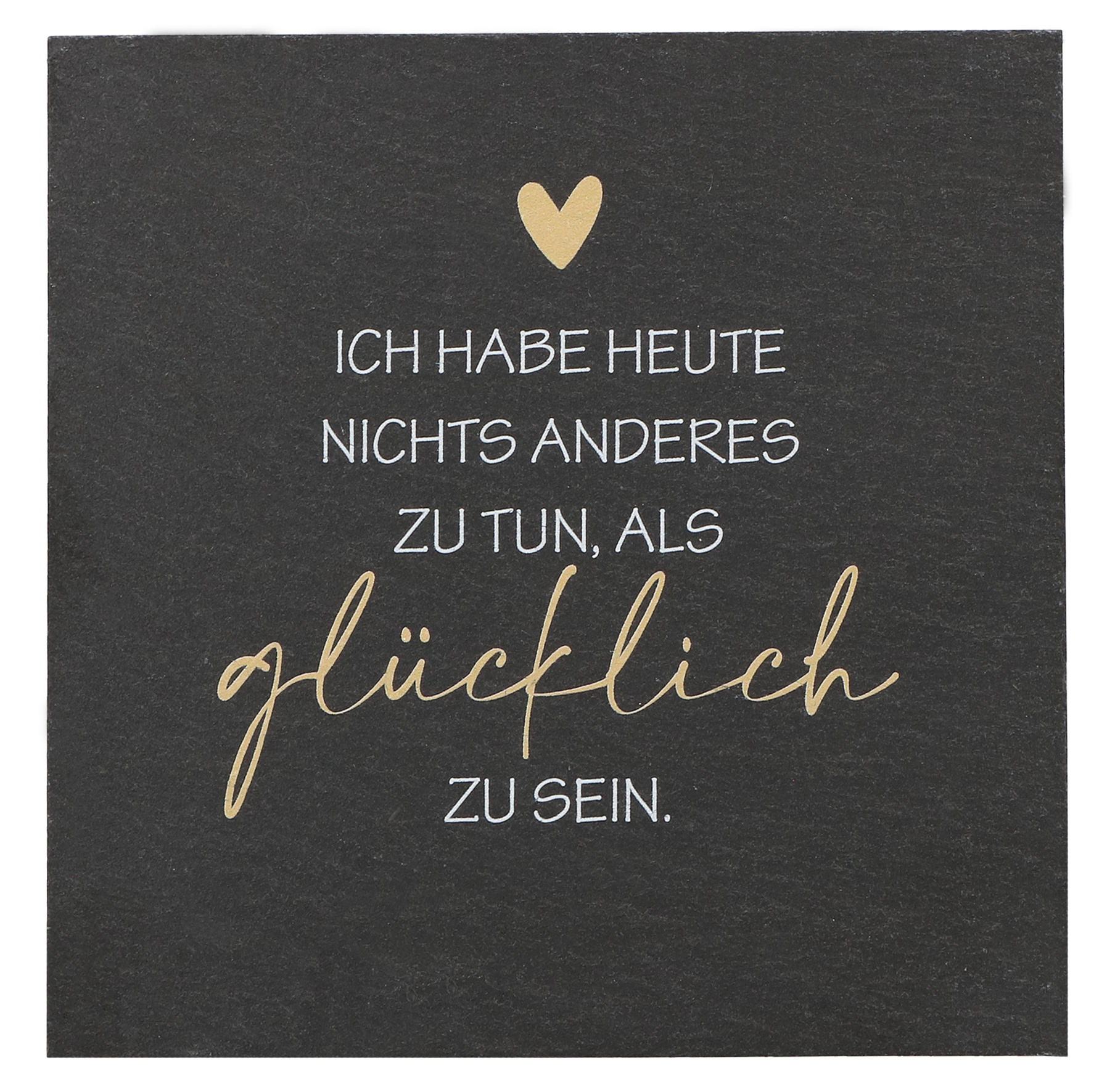 Dieses im wahrsten Sinne des Wortes ansprechende Naturprodukt eignet sich bestens als Geschenk zum Geburtstag. Die Schiefertafel im Format 12 x 12 cm wurde mit dem Motivationstext Ich habe heute nichts anderes zu tun, als glücklich zu sein. und einem Herzen gestaltet. Zusammen mit dem Holzsockel aus echtem Buchenholz lässt sich das schöne Deko-Objekt beispielsweise auf dem Sideboard, dem Nachttisch oder dem Schreibtisch platzieren.