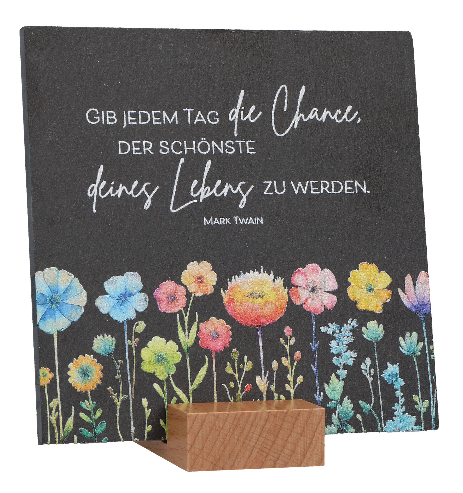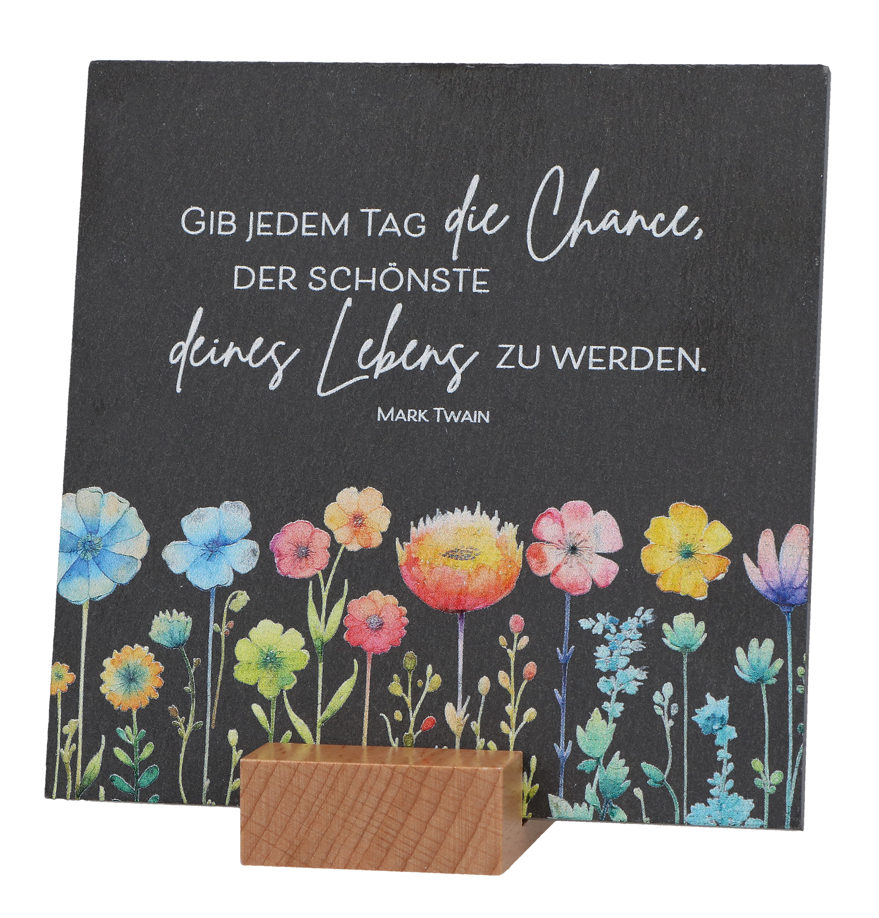 Dieses im wahrsten Sinne des Wortes ansprechende Naturprodukt eignet sich bestens als Geschenk zum Geburtstag. Die Schiefertafel im Format 12 x 12 cm wurde mit dem Motivationstext: Gib jedem Tag die Chance, der schönste deines Lebens zu werden. und bunten Blumen gestaltet. Zusammen mit dem Holzsockel aus echtem Buchenholz lässt sich das schöne Deko-Objekt beispielsweise auf dem Sideboard, dem Nachttisch oder dem Schreibtisch platzieren.