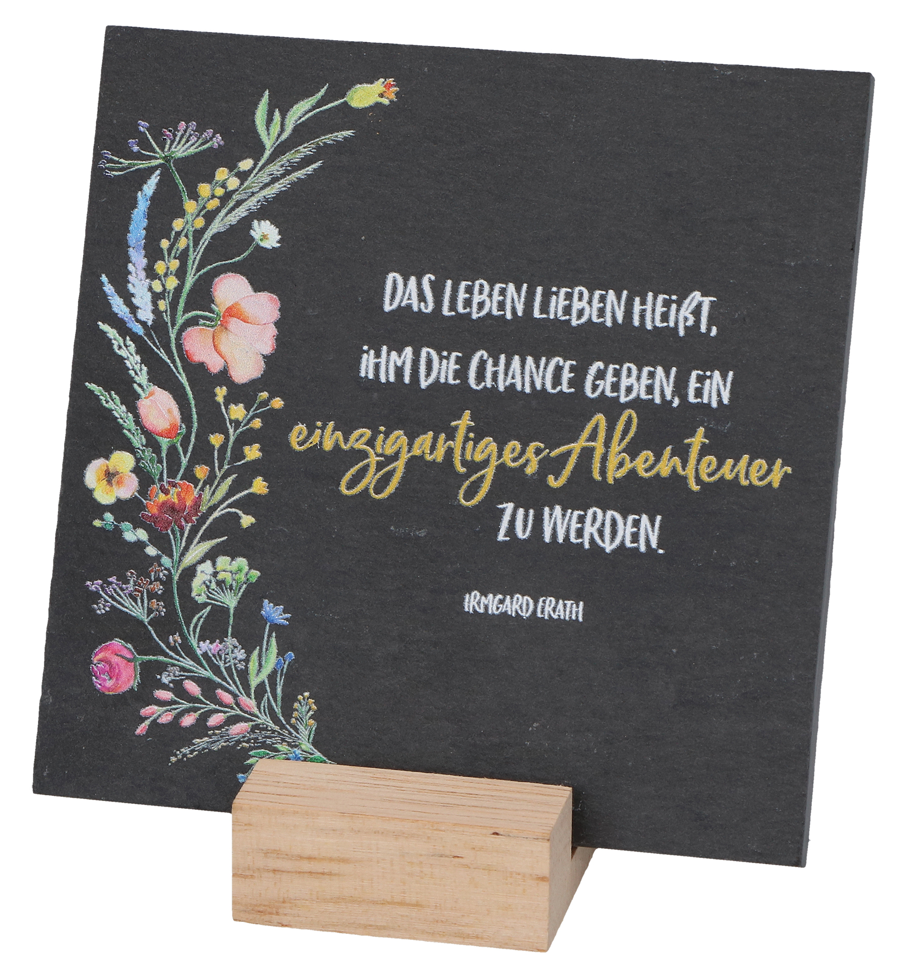 - Inhalt: Schiefertafel, farbig bedruckt, mit Holzsockel zum Aufstellen, Lieferung auf Backcard,