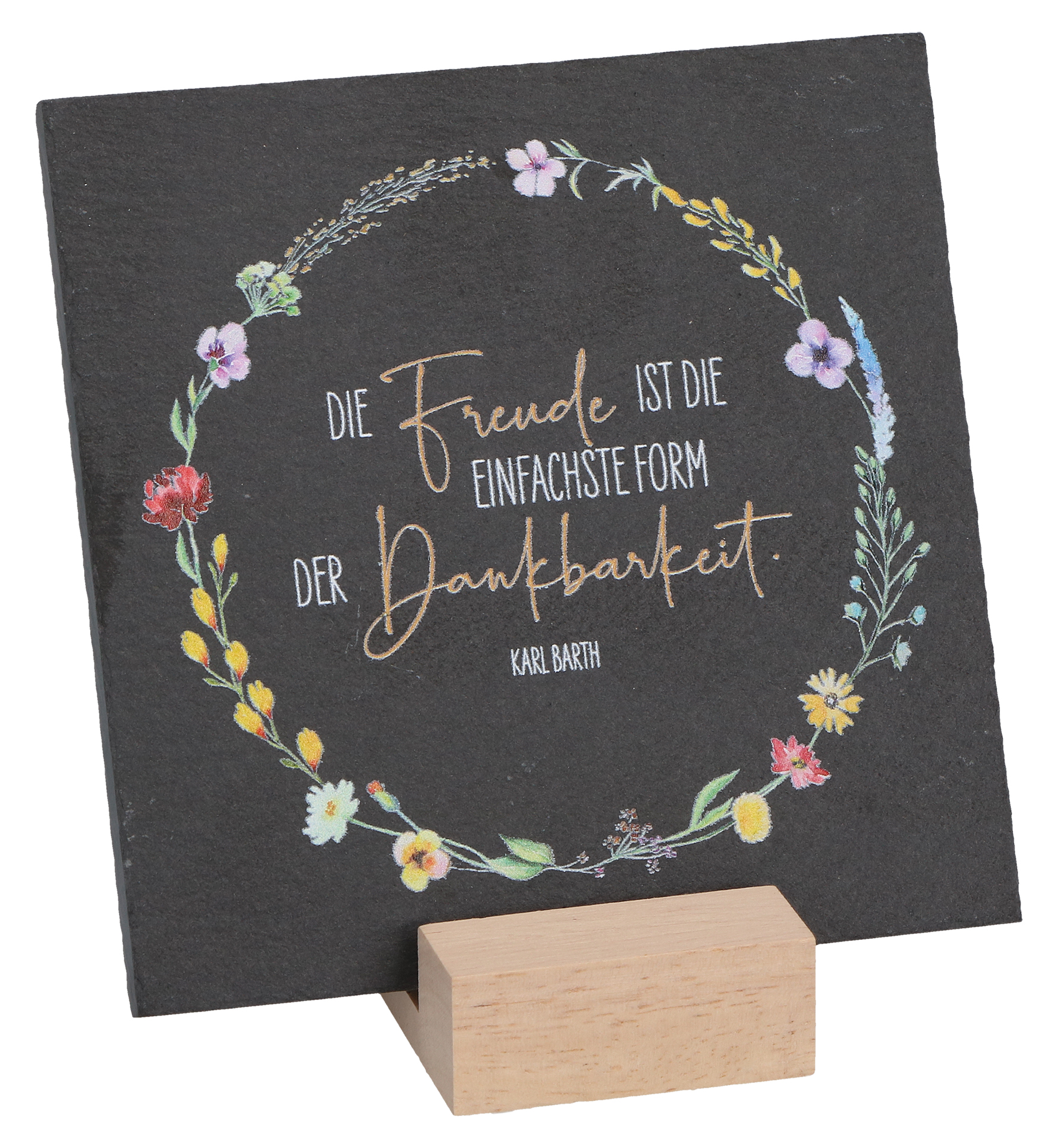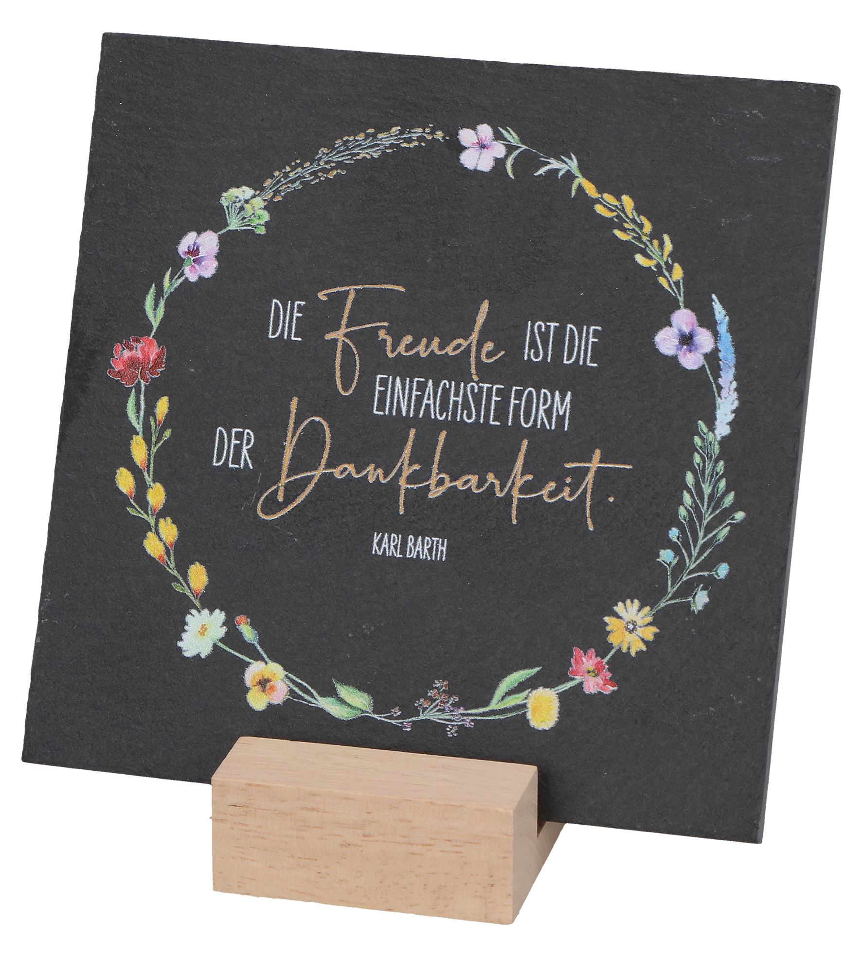 - Inhalt: Schiefertafel, farbig bedruckt, mit Holzsockel zum Aufstellen, Lieferung auf Backcard,