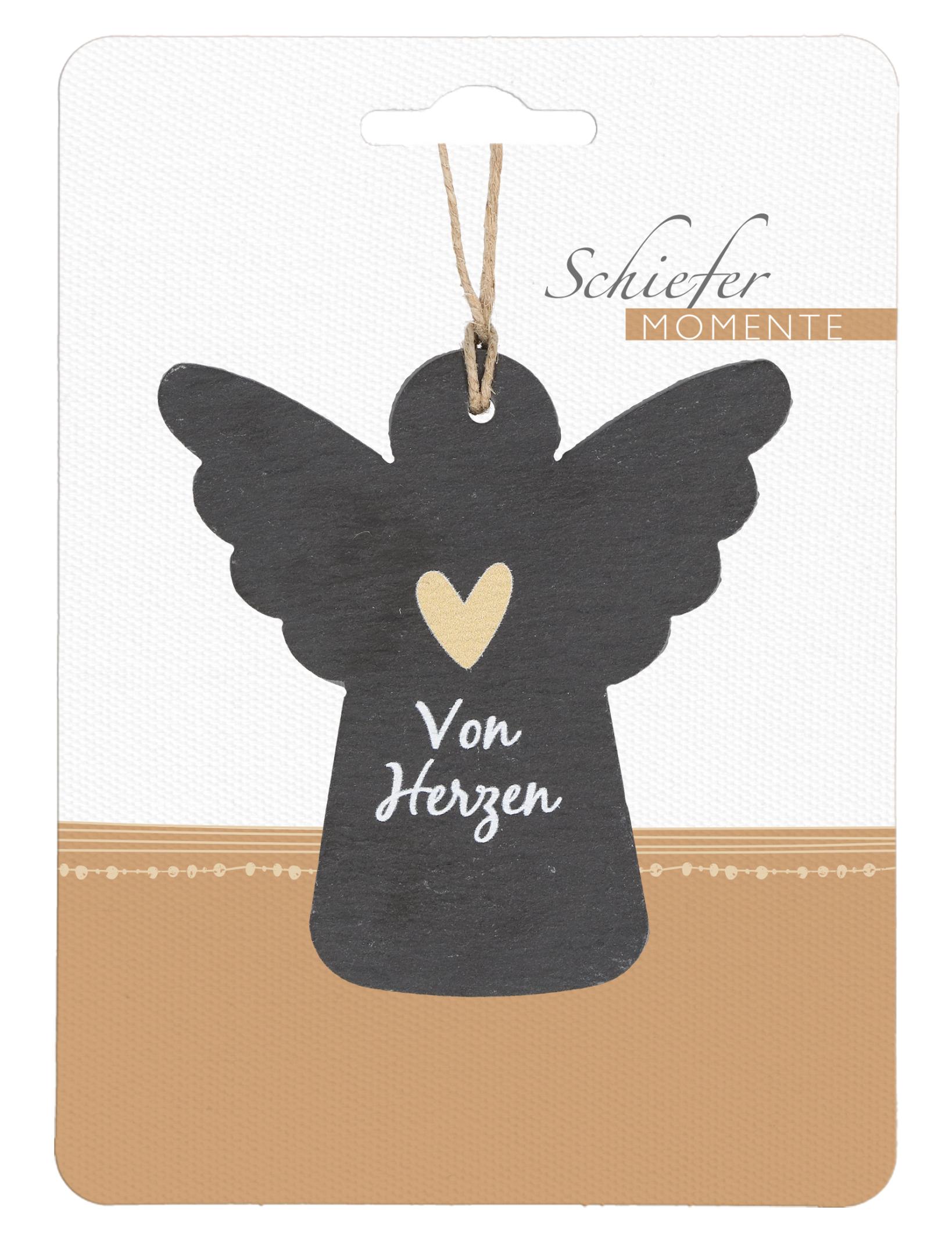 - Inhalt: Engel-Anhänger aus Schiefer, weiß bedruckt, mit Hanfband zum Aufhängen, Lieferung auf Backcard mit Eurolochung, folienfrei verpackt,