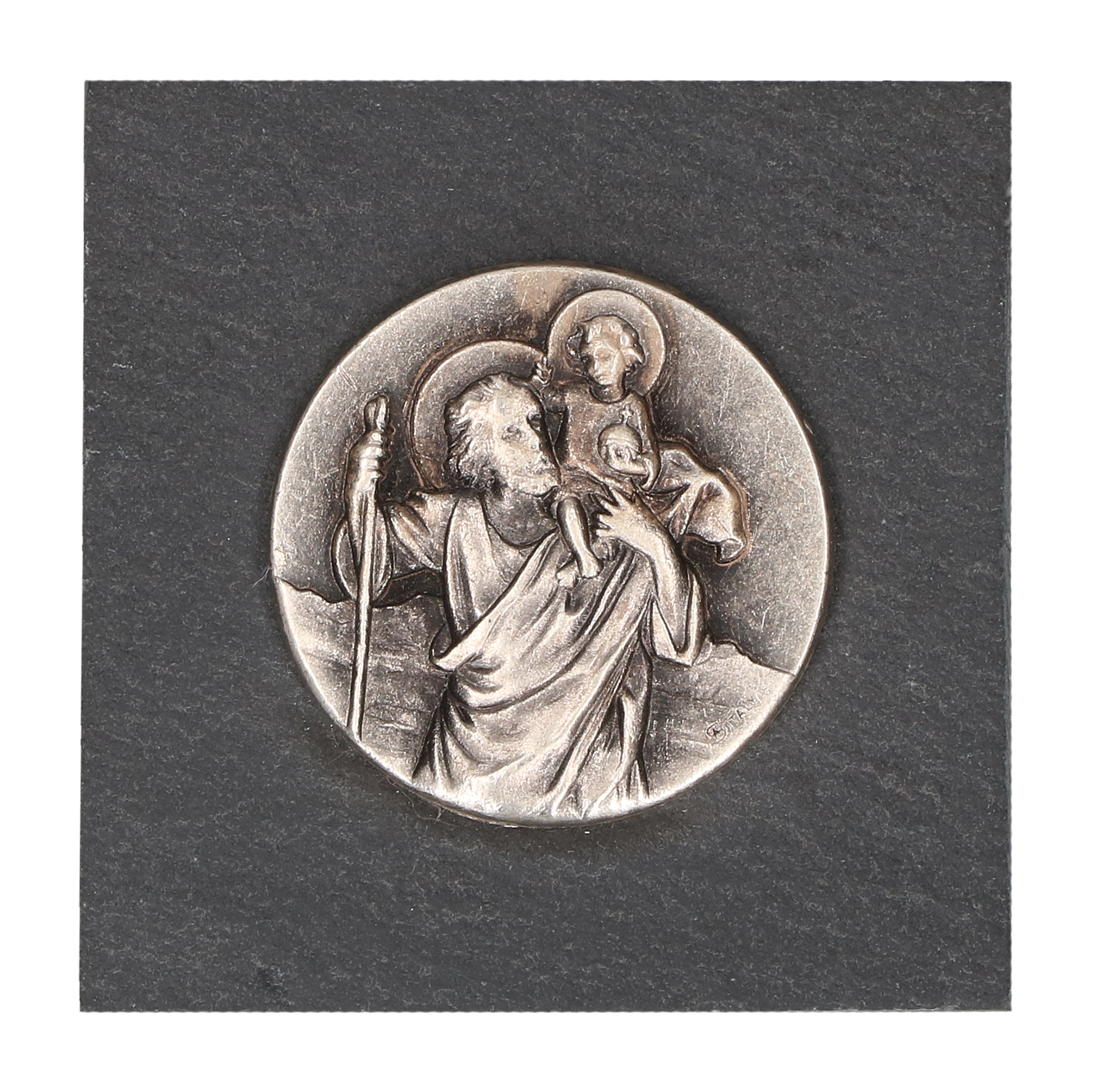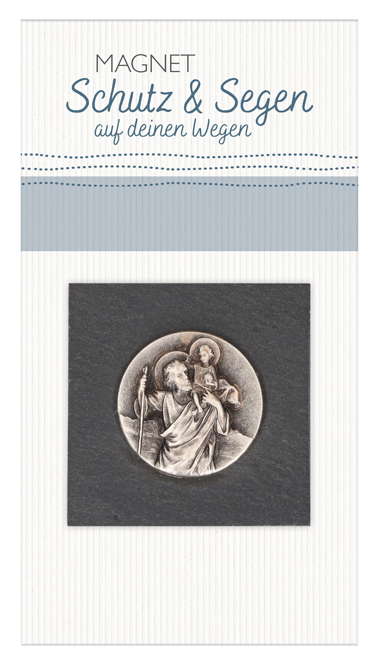 • Inhalt: Schiefer-Magnet mit Christophorus-Plakette aus Metall, mit selbstklebernder Magnet-Metallplatte; Lieferung auf Backcard,