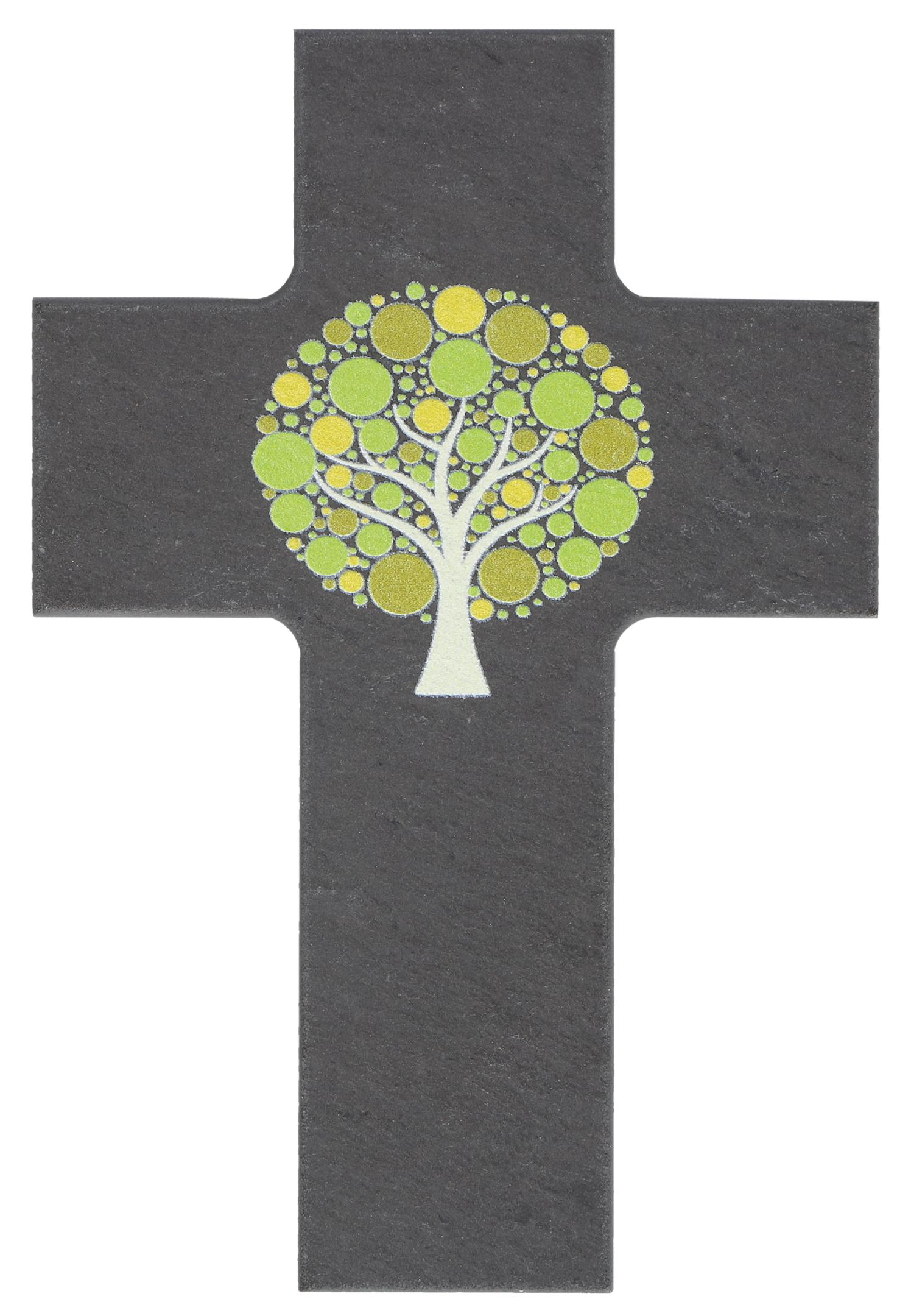 Das Kreuz ist aus dem Naturmaterial Schiefer gefertigt, auf ihm befindet sich ein farbig gedruckter Baum. Im Christentum symbolisiert der Baum des Lebens ewiges Leben, Weisheit und die Verbindung zwischen Himmel und Erde. Hier gehen Erfahrung und Tradition eine gelungene Symbiose mit dem künstlerischen Gespür für neue und moderne Formen und Materialien ein. Das sakrale Kunstwerk misst insgesamt 7,5 x 11 cm.