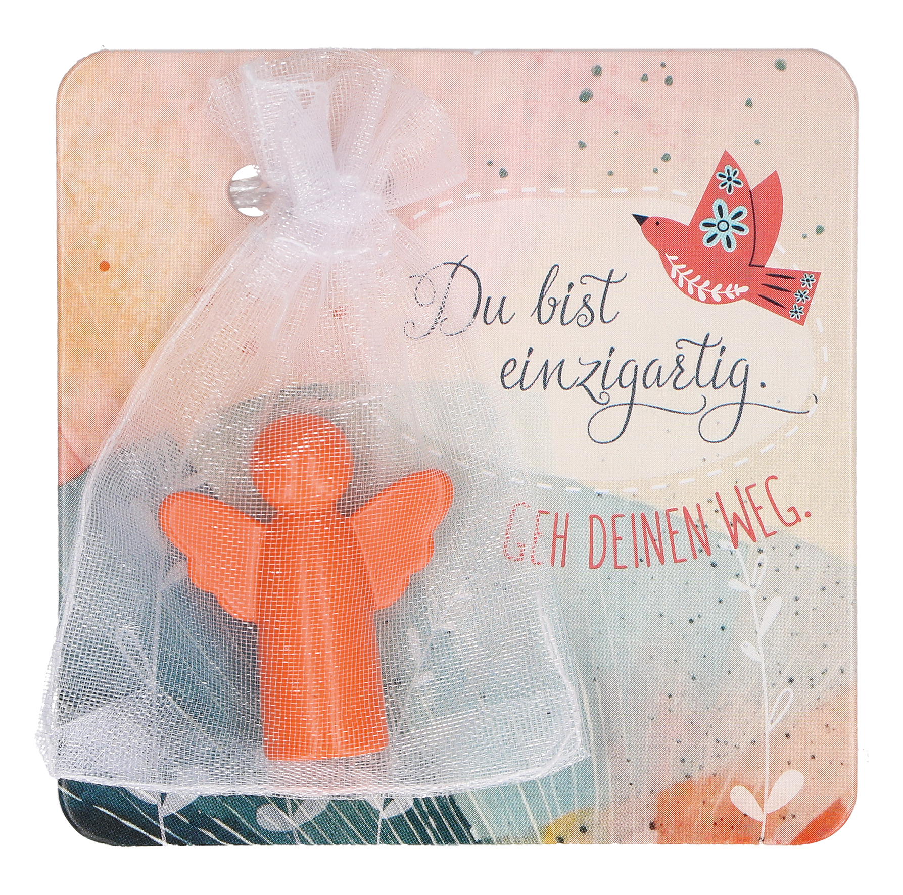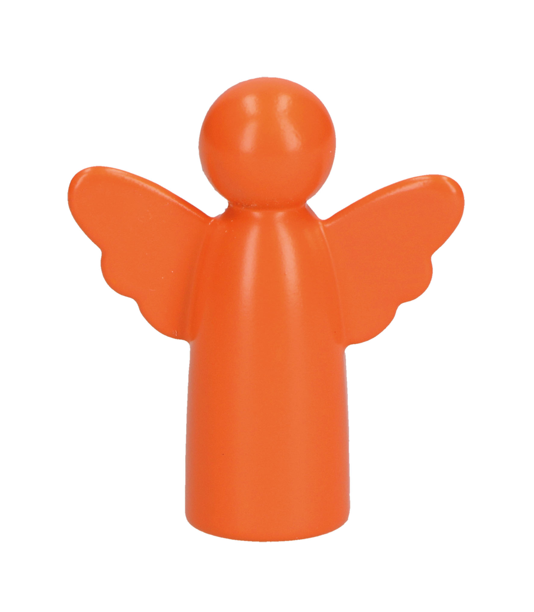 Engel-Figur aus Feinmetall in orange-matt, zum Aufstellen, Lieferung in Organzabeutel auf Backcard