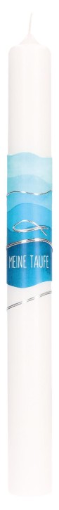 Unsere Taufkerze mit den Maßen 400x40 mm ist ein wunderschönes und symbolisches Geschenk zur Taufe. Sie zeigt ein blaues Wellenmotiv mit einem silbernen Fisch und wird in einer ansprechenden Geschenkverpackung geliefert.