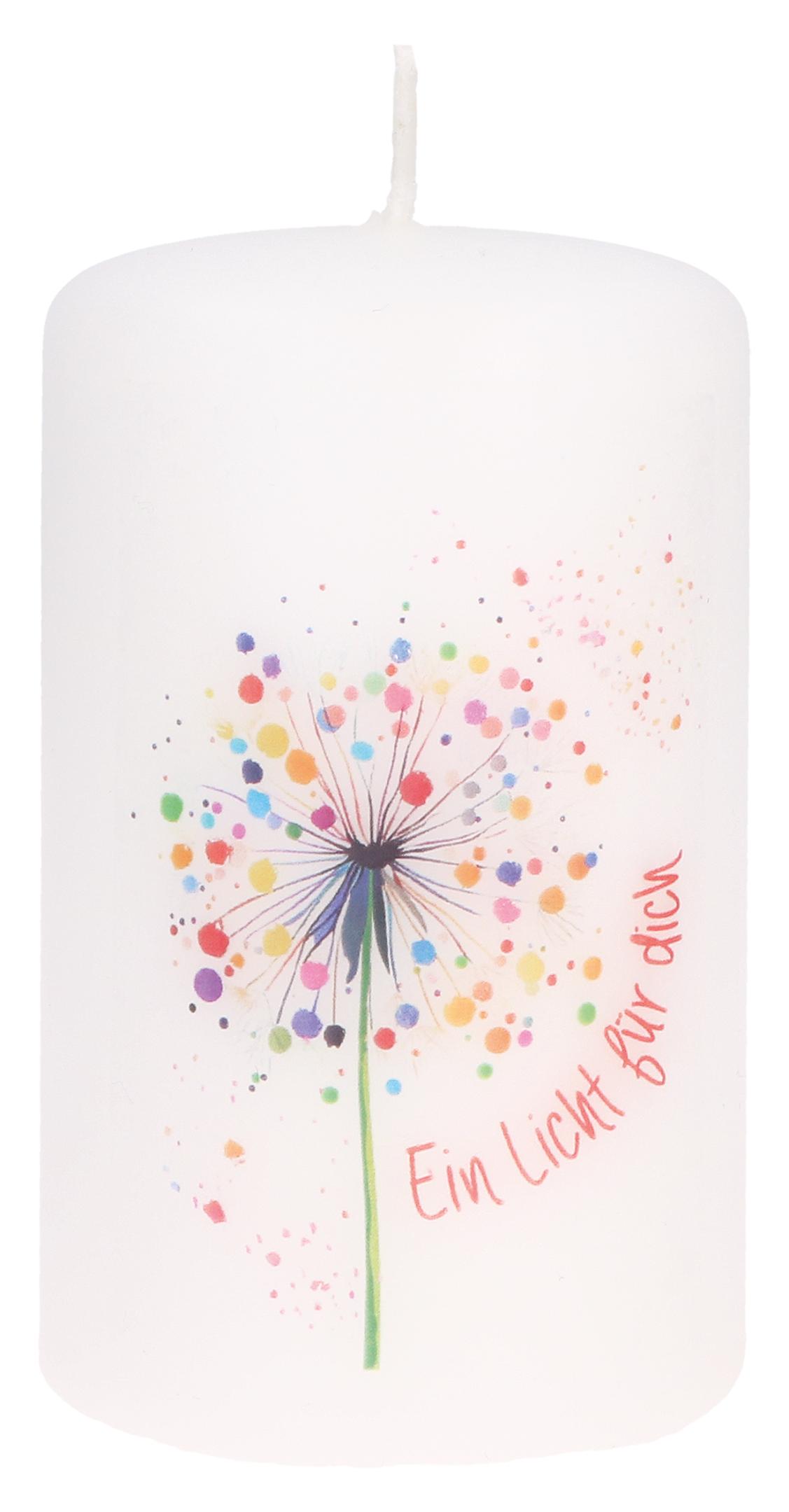 - Inhalt: Stumpenkerze mit Druckmotiv; Brenndauer ca. 28 Stunden,