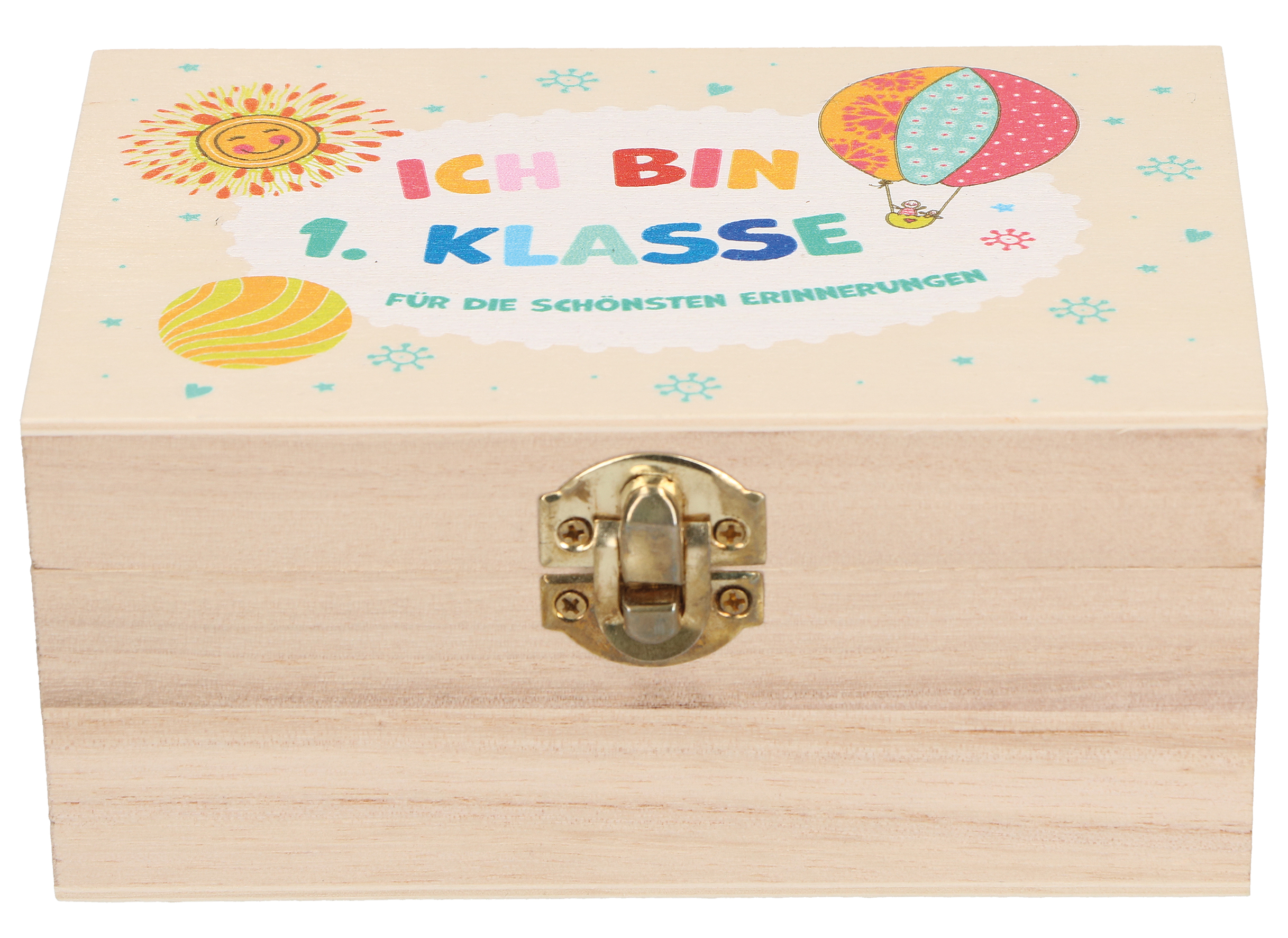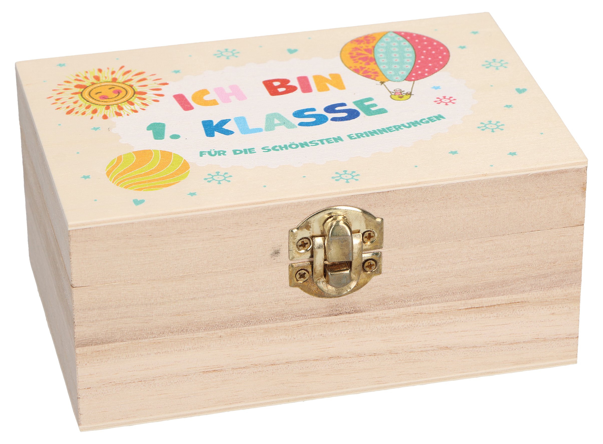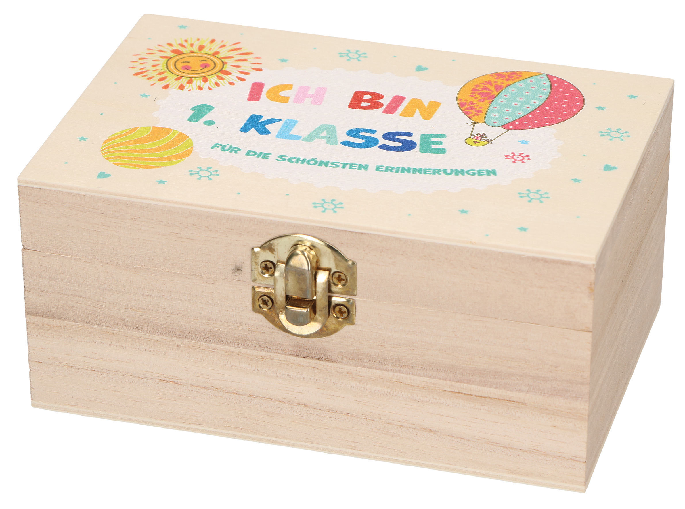 • Inhalt: Erinnerungskiste aus Holz, farbig bedruckt, mit Verschluss,