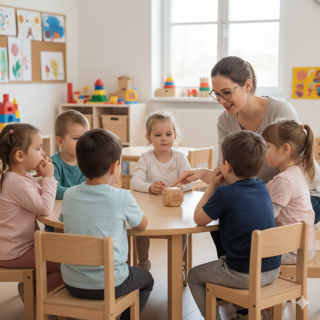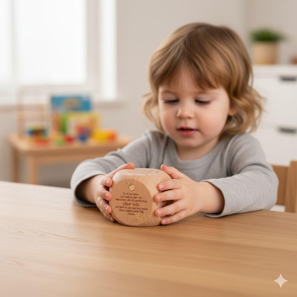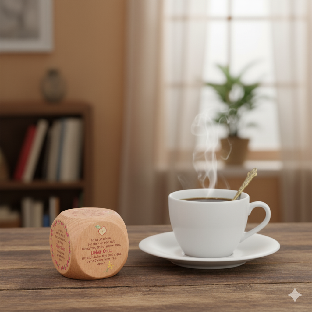 Unser Gebetswürfel mit einer Größe von 6x6 cm aus naturbelassenem Holz und farbiger Prägung mit Tischgebeten bietet eine schöne Möglichkeit, Dankbarkeit und Verbundenheit beim gemeinsamen Essen auszudrücken.