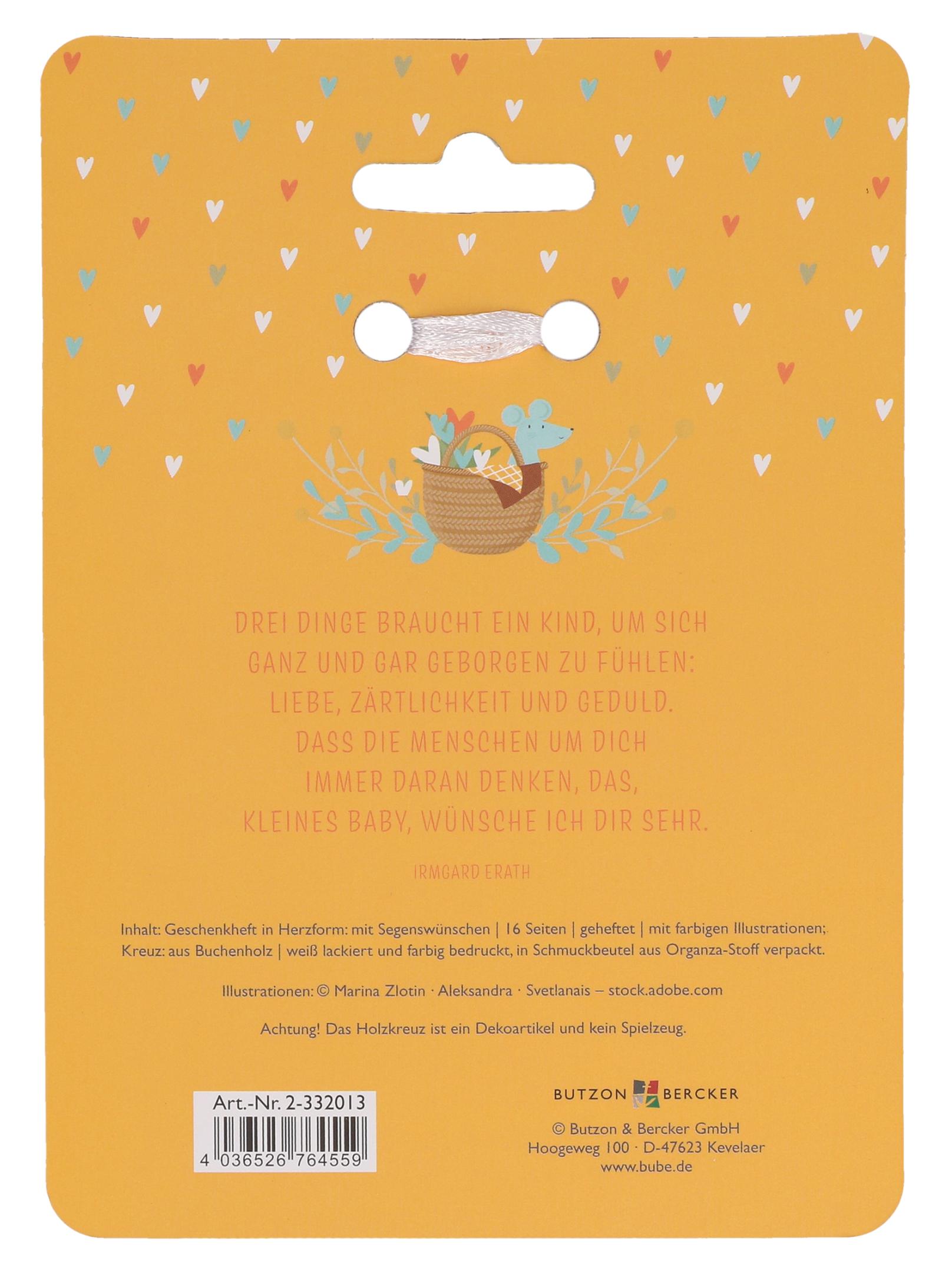 - Inhalt: Handschmeichlerkreuz aus Buchenholz, weiß lackiert und farbig bedruckt, 4 x 6 cm; mit Geschenkheft in Herzform, 9 x 9 cm; Lieferung in Organzabeutel auf Backcard,