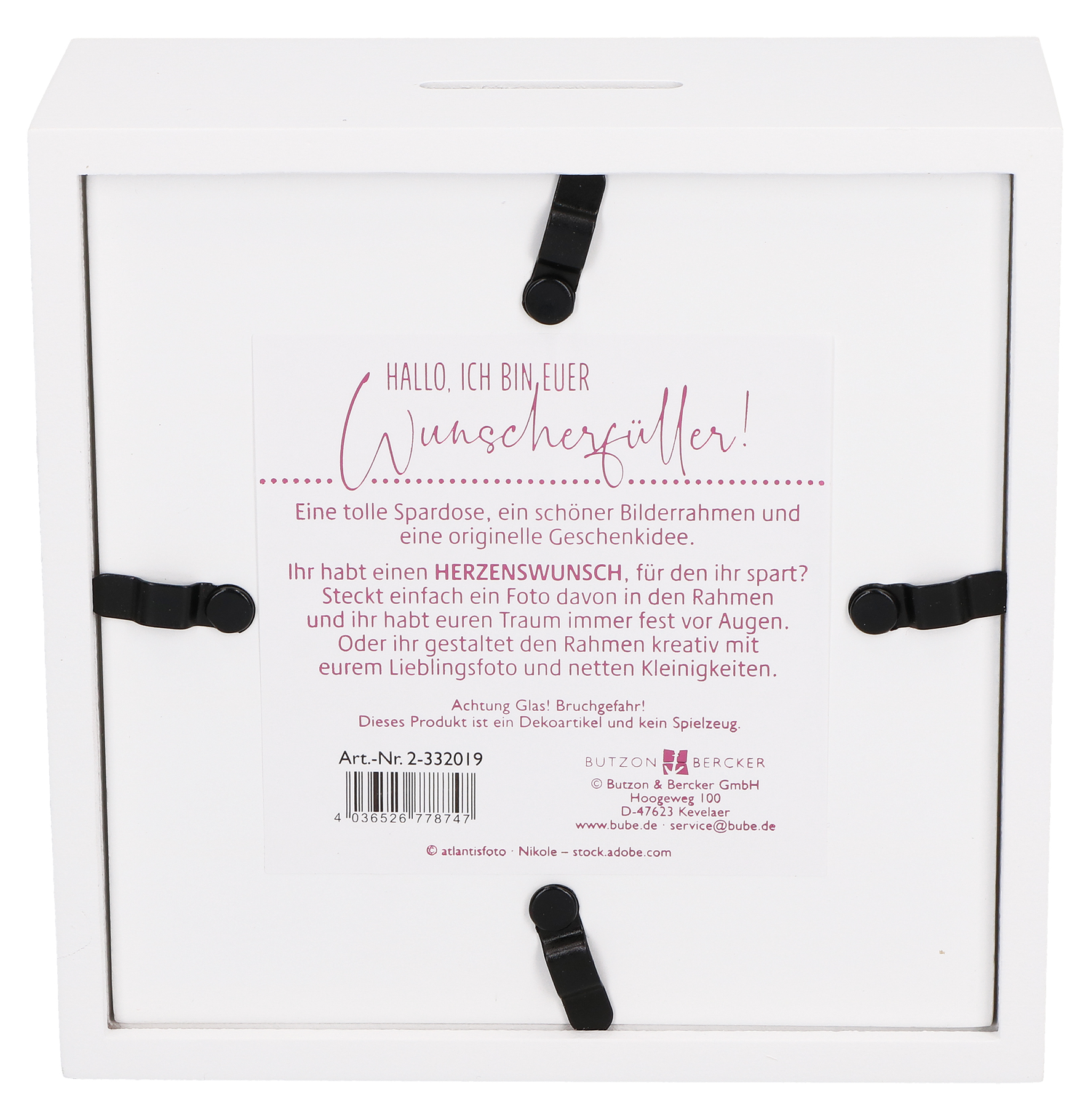 Eine liebevoll gestaltete Bilderrahmen-Spardose und eine tolle Geschenkidee. Mit einem Lieblingsfoto und netten Kleinigkeiten gefüllt ein echter Wunscherfüller für euch. Entfernt einfach die Rückwand und werdet kreativ. Eine tolle MOTIVATION, ein schöner HINGUCKER, ein wahrer SEGENSBRINGER.