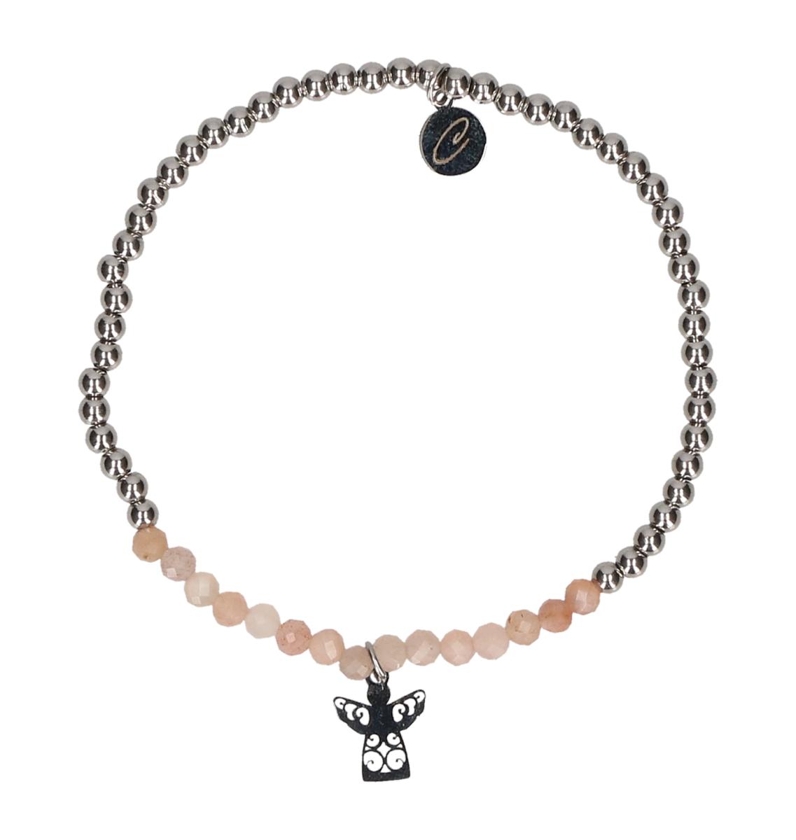 Stretch-Armband mit Edelstahlperlen und Echtsteinperlen aus Sonnenstein, mit Engel-Anhänger aus Edelstahl; Lieferung in Geschenkverpackung