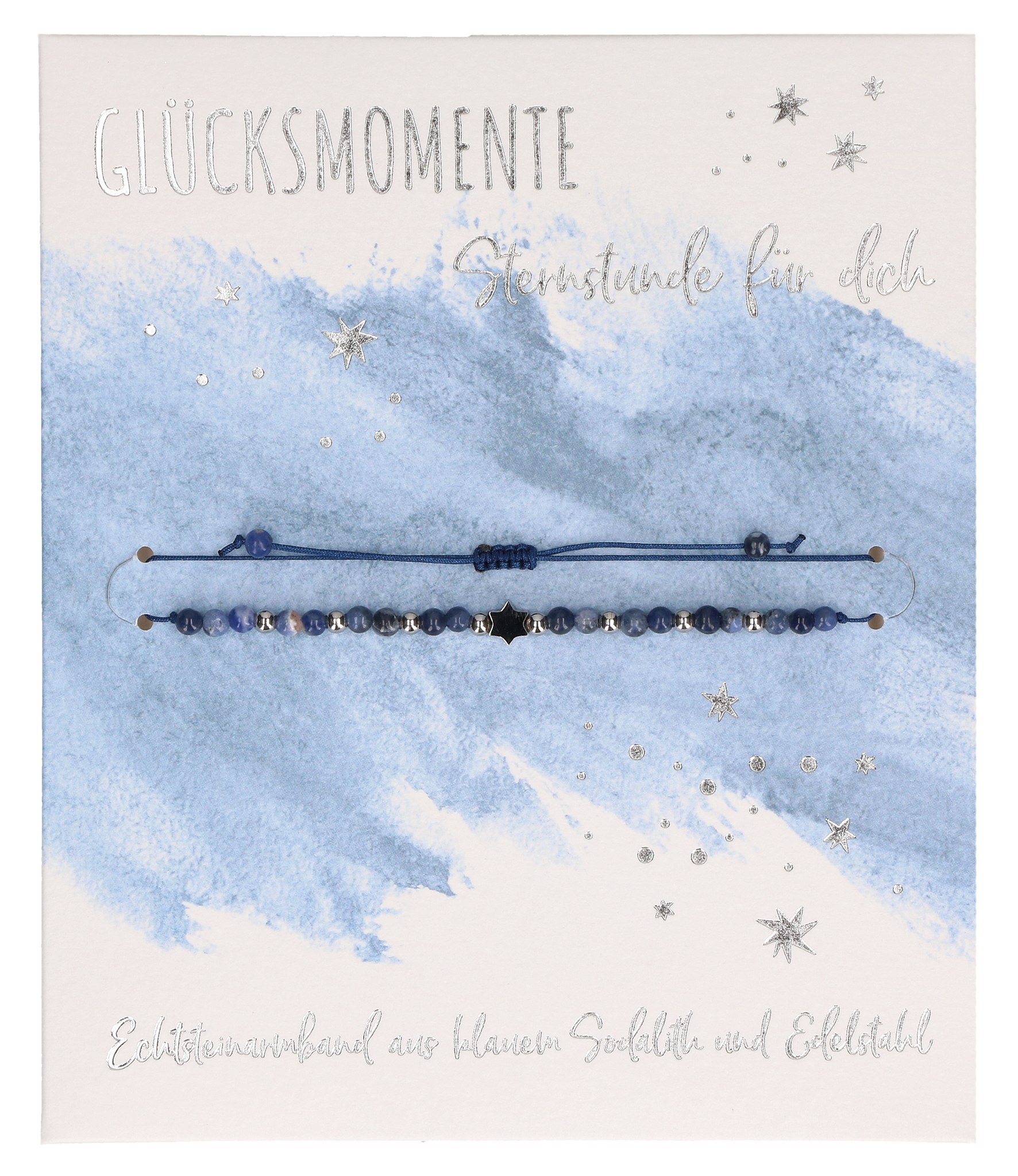 - Inhalt: Textil-Armband mit Edelsteinperlen aus Sodalith und Stern-Anhänger aus Edelstahl; mit stufenlosem Schiebeverschluss für individuelle Größenverstellung; Lieferung in Geschenkverpackung,