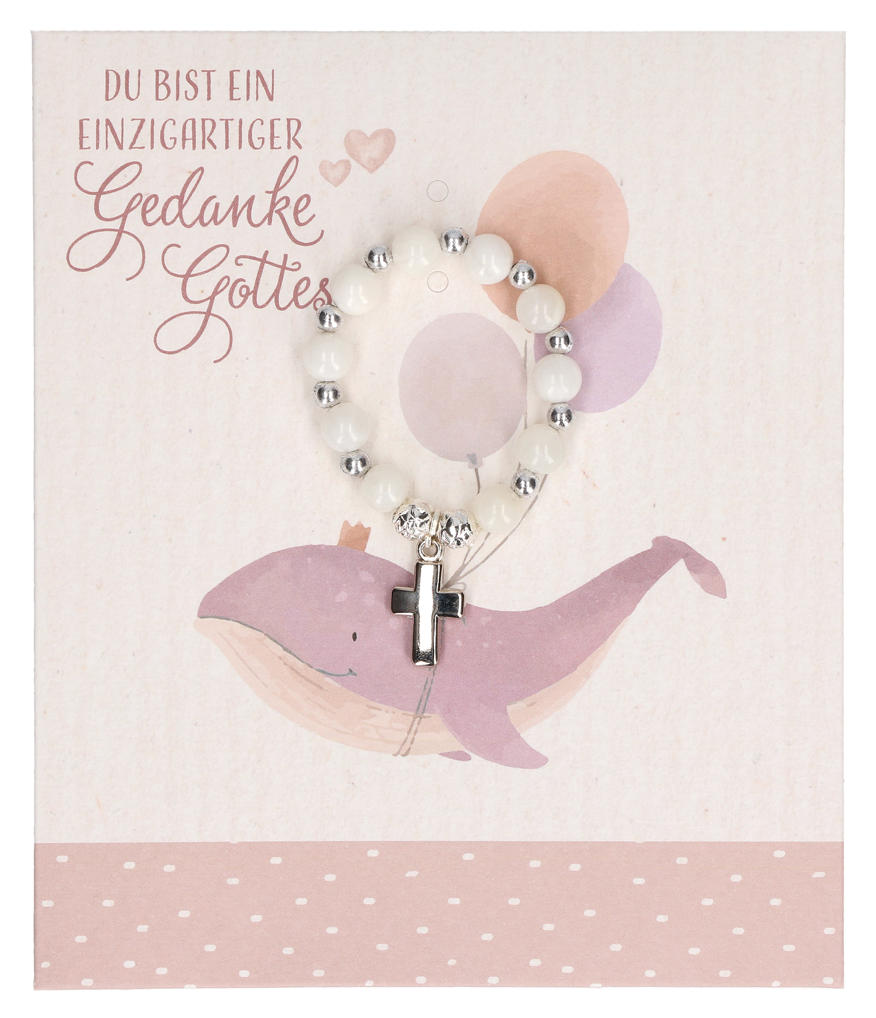 Das Strech-Armband "Du bist ein einzigartiges Gedanke Gottes" hat einen Innendurchmesser von ca. 3,2 cm. Das Armband besteht aus weißen Glasperlen, Rosenperlen aus Metall und filigranem Kreuz-Anhänger aus Metall. Das Kreuz ist ein religiöses Symbol und damit ein Zeichen für Jesus und seine nie endende Liebe zu uns Menschen.