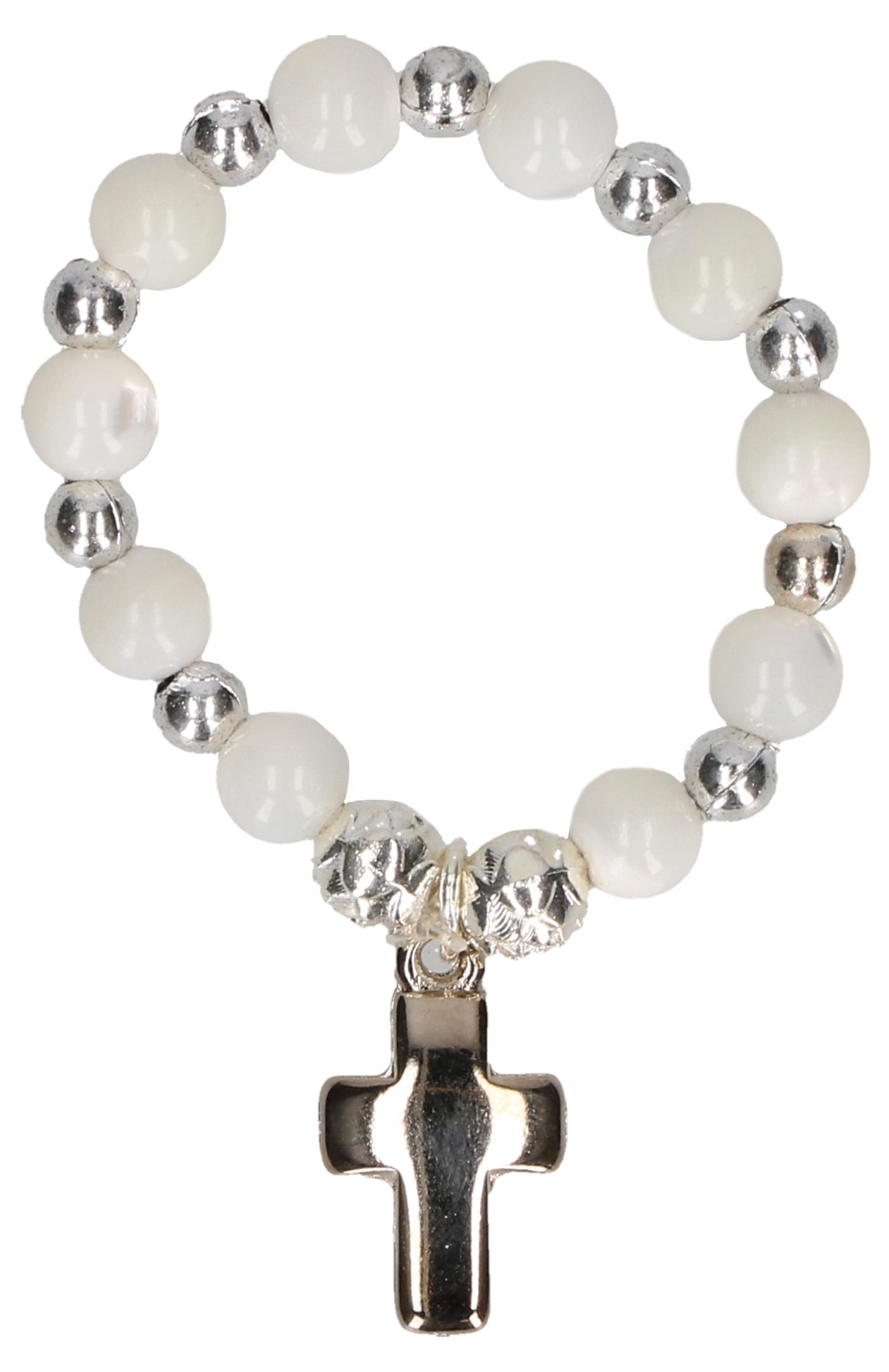 - Inhalt: Stretch-Armband aus wei?en Glasperlen, Rosenperlen aus Metall und Kreuz-Anh?nger aus Metall; Lieferung in Geschenkverpackung,