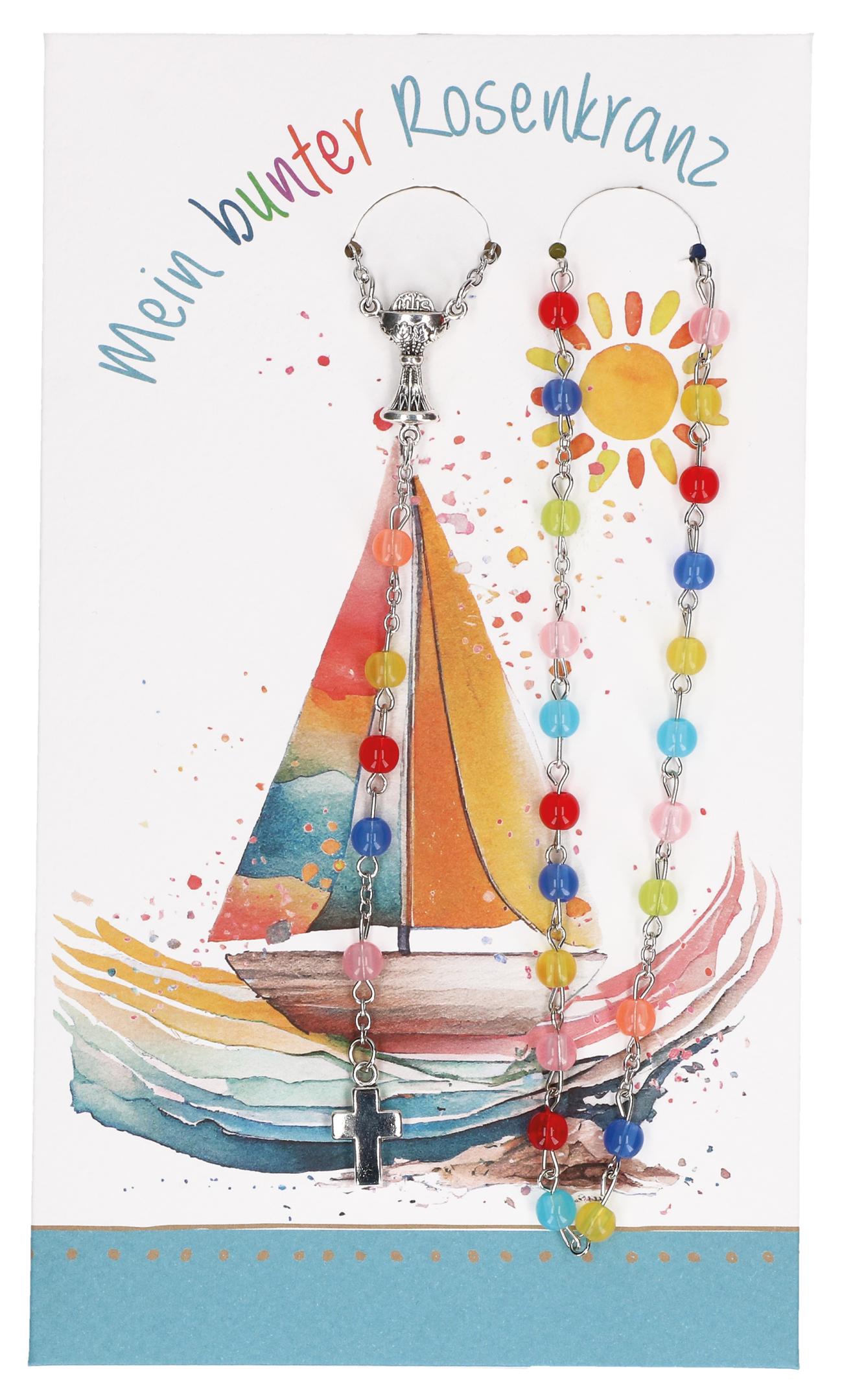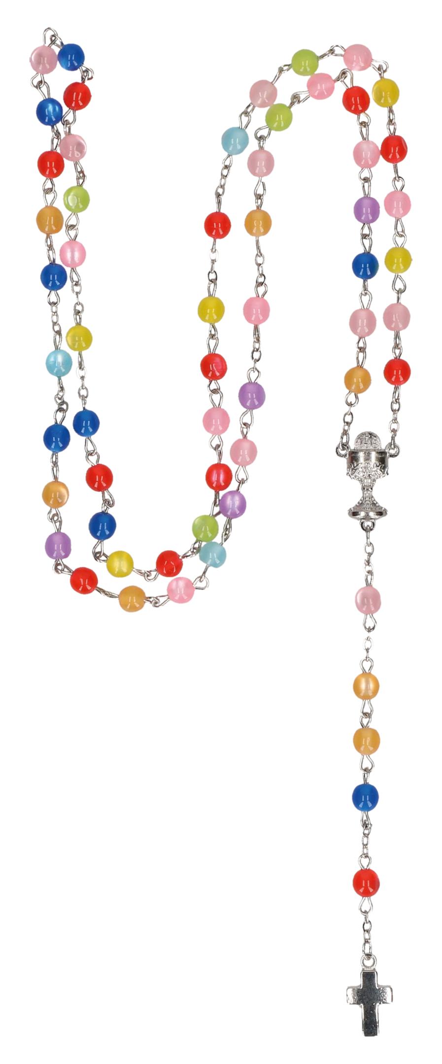 - Inhalt: Rosenkranz mit bunten Glasperlen, gekettelt, mit Kelch und Kreuz aus Metall, 46,5 cm lang; Lieferung in Geschenkverpackung,