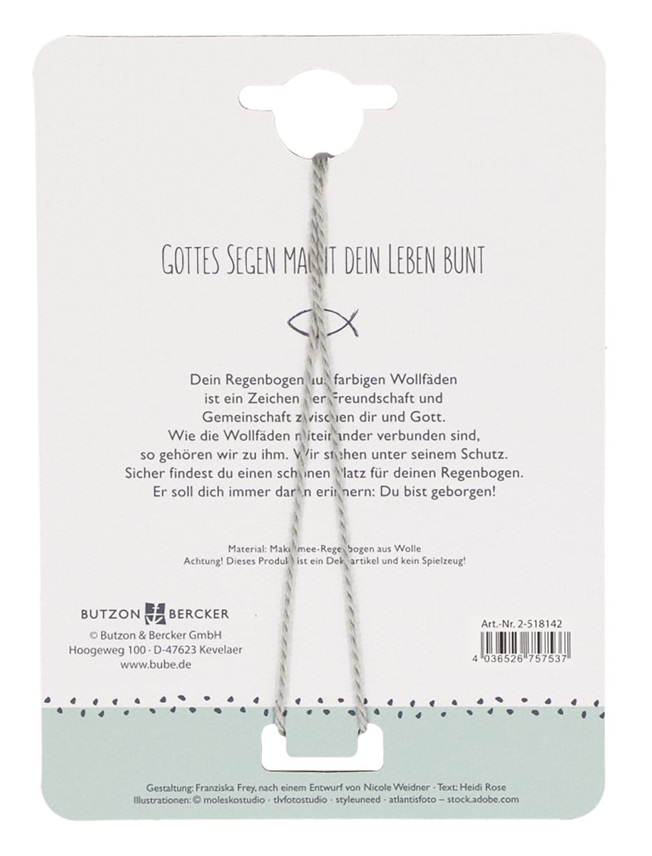 Dein Regenbogen aus farbigen Wollfäden ist ein Zeichen der Freundschaft und Gemeinschaft zwischen dir und Gott. Wie die Wollfäden miteinander verbunden sind, so gehören wir zu ihm. Wir stehen unter seinem Schutz. Sicher findest du einen schönen Platz für deinen Regenbogen. Er soll dich immer daran erinnern: Du bist geborgen!