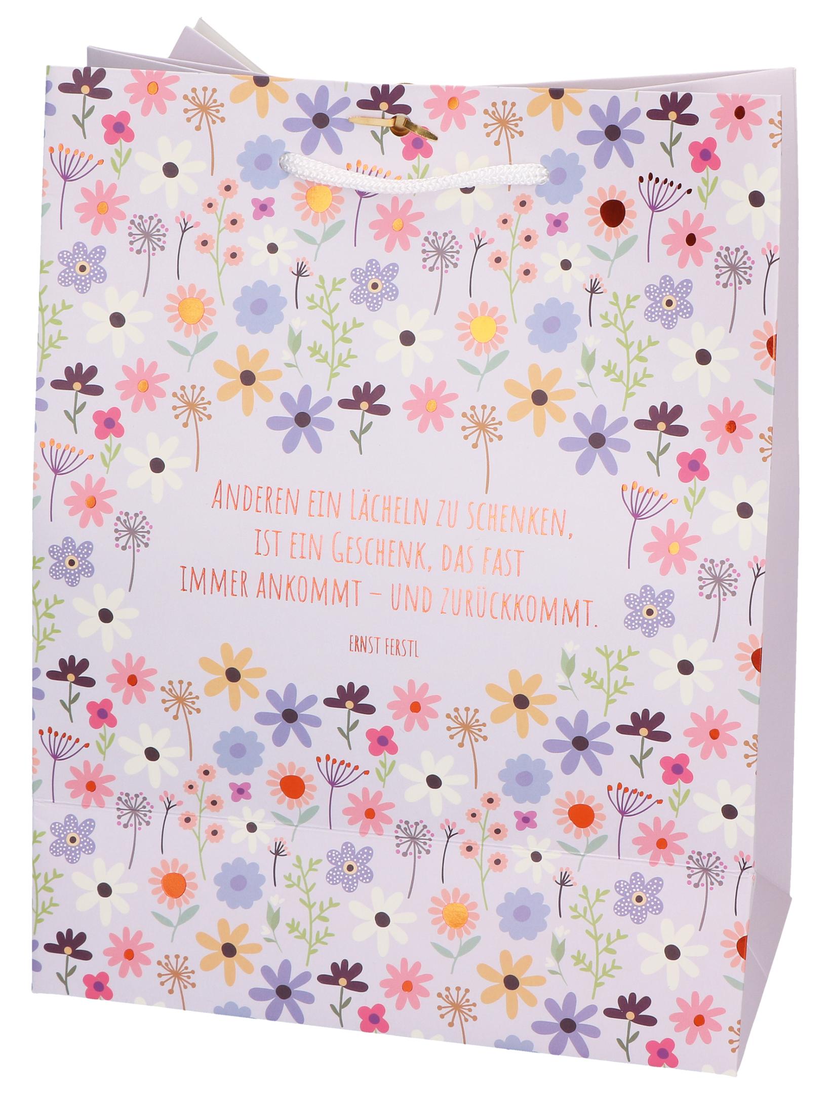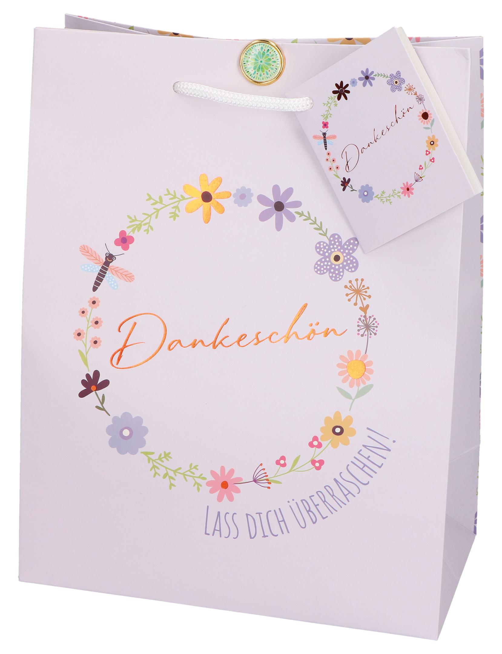 - Inhalt: Geschenktüte als Dankeschön, farbig bedruckt und mit Folienprägung veredelt, mit Tragekordel und einem Brad als Verschluss ,