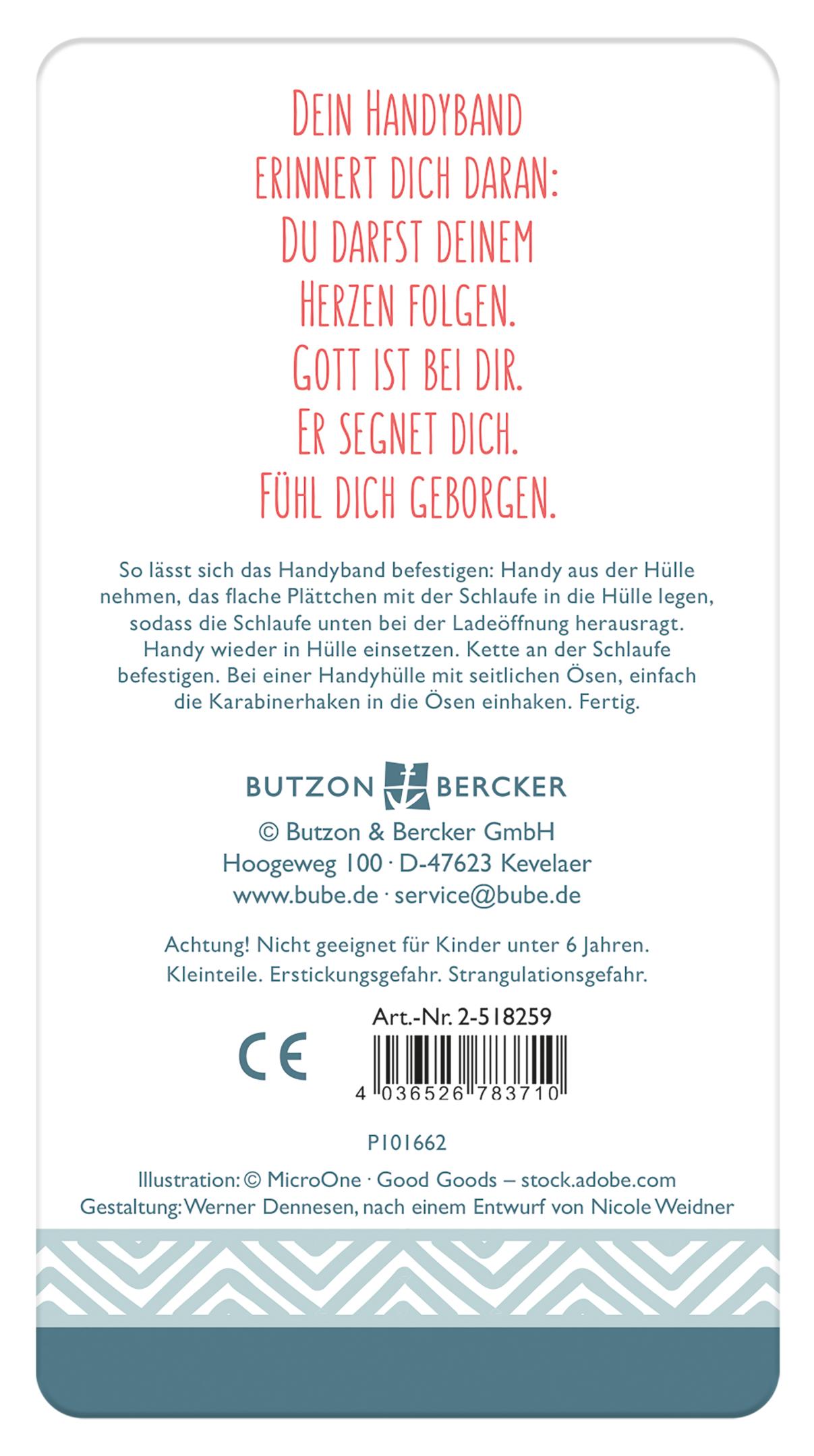 Dein Handyband erinnert dich daran: Du darfst deinem Herzen folgen. Gott ist bei dir. Er segnet dich. Fühl dich geborgen.