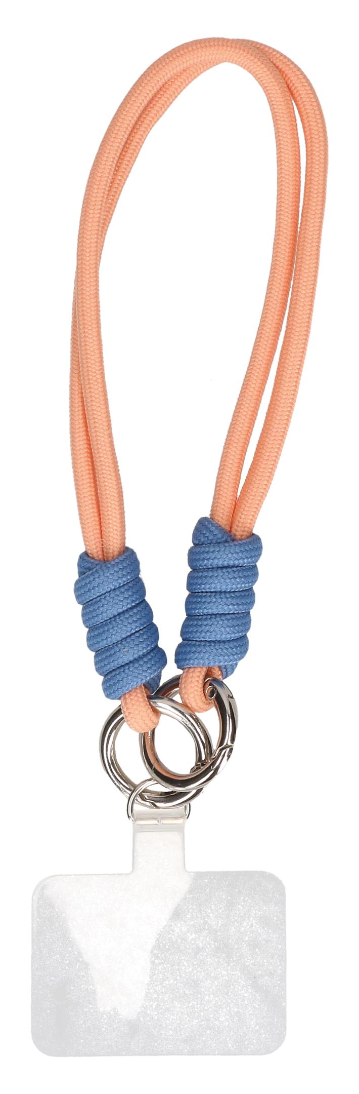 - Inhalt: Handykordel für das Handgelenk in lachs-blau mit silberfarbenen Metallringen und transparenter Universal-Handyhalterung, ca. 36,5 cm lang; Lieferung auf Backcard in Folienbeutel,
